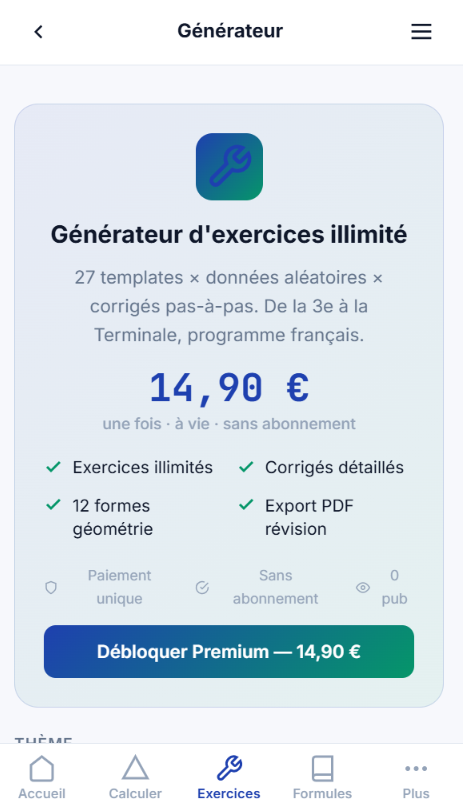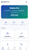 Maths Pro est une calculatrice mathématique avancée avec générateur d'exercices corrigés pour le programme français 3e-Terminale. 14,90 € une fois, pas d'abonnement.
