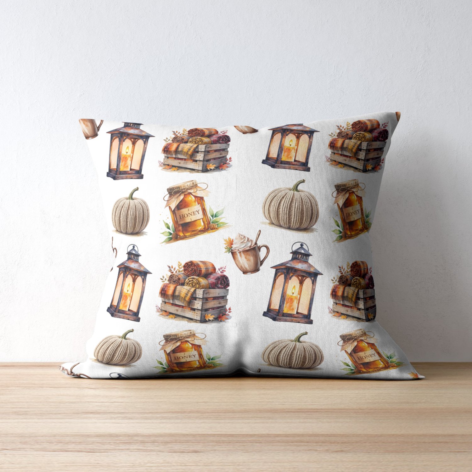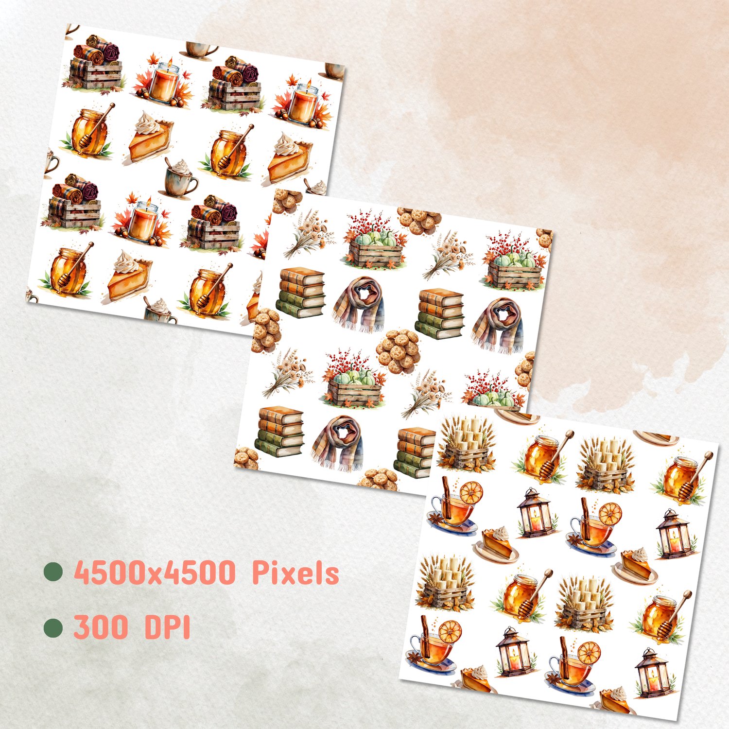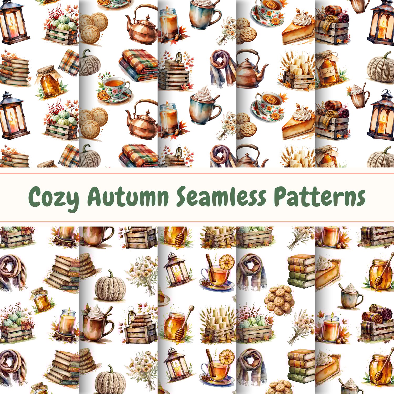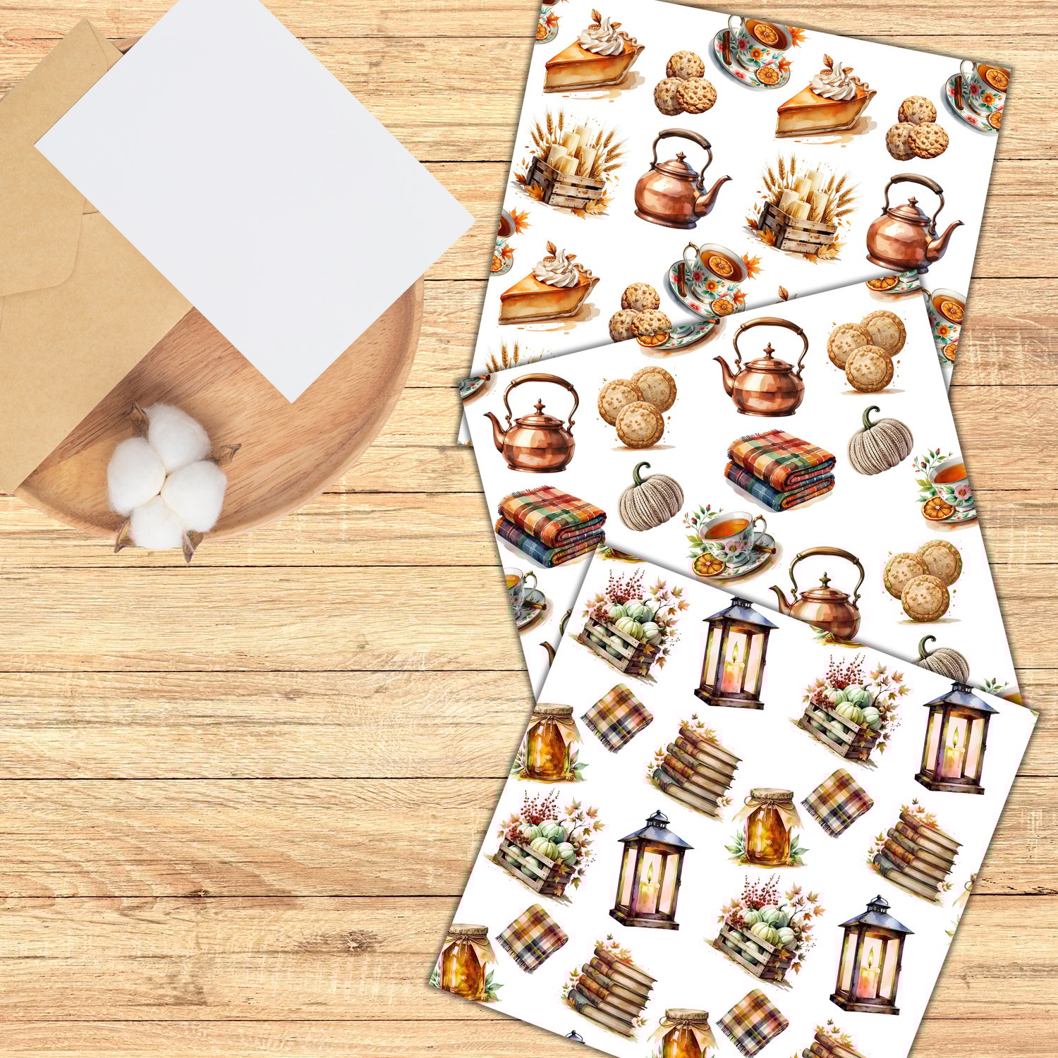 Celebrate the beauty of the season with this Cozy Autumn Seamless Pattern Collection, featuring a harmonious blend of warm and rustic elements. Each design captures the essence of fall with details like mugs of hot chocolate, slices of pumpkin pie, honey jars, plaid blankets, vintage books, knitted pumpkins, and glowing lanterns. With rich autumn tones and a hygge-inspired aesthetic, these patterns evoke a feeling of warmth, comfort, and seasonal charm.