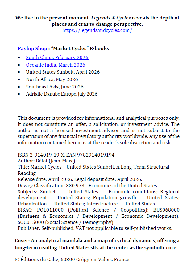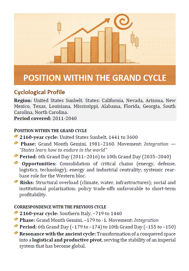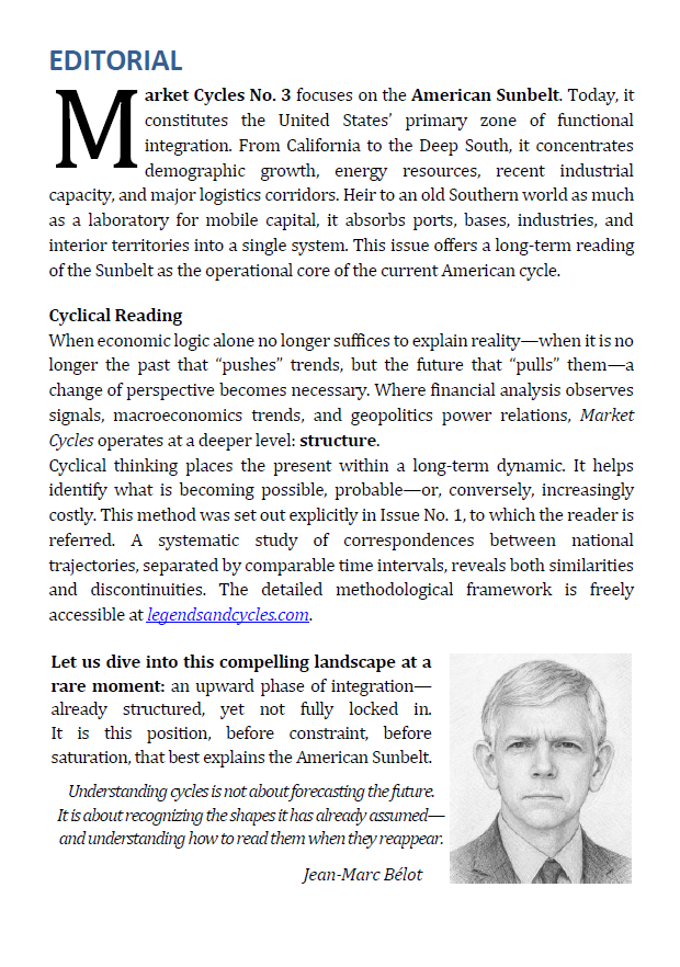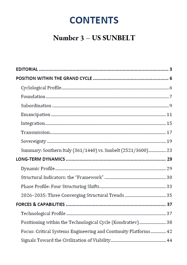 This booklet offers a long-term structural reading of the United States Sunbelt as the operational core of the contemporary Western system, beyond short-term market narratives.