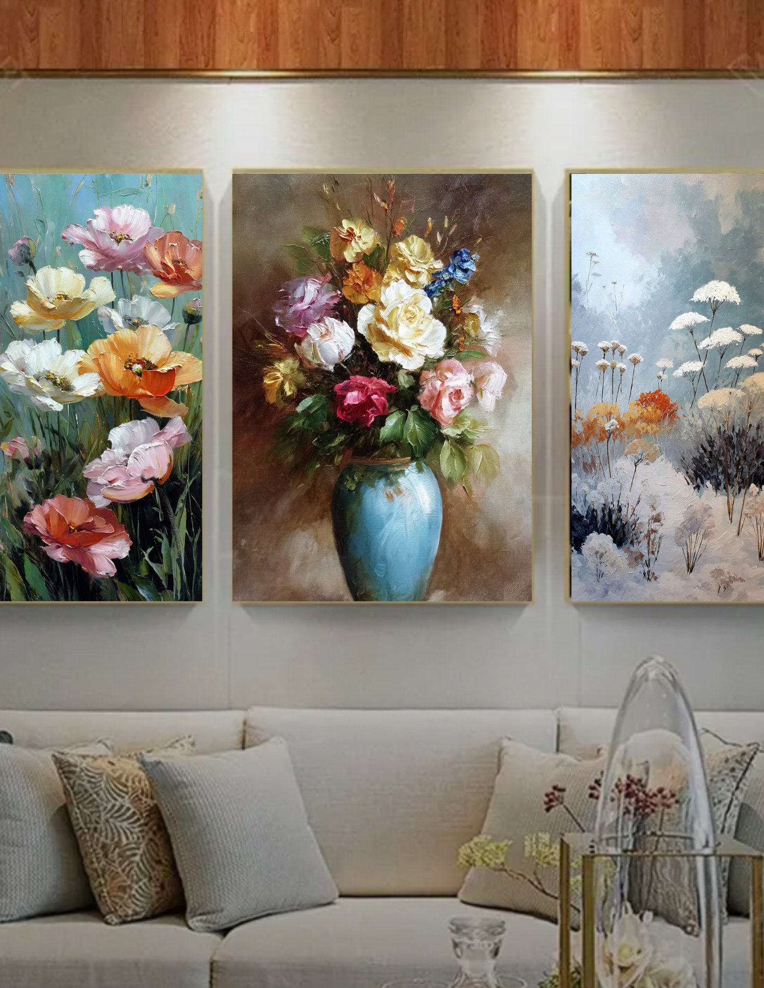 Whether you are decorating a formal dining area, a luxury bedroom, or a chic living room, this triptych offers a cohesive narrative of nature’s beauty through the seasons.