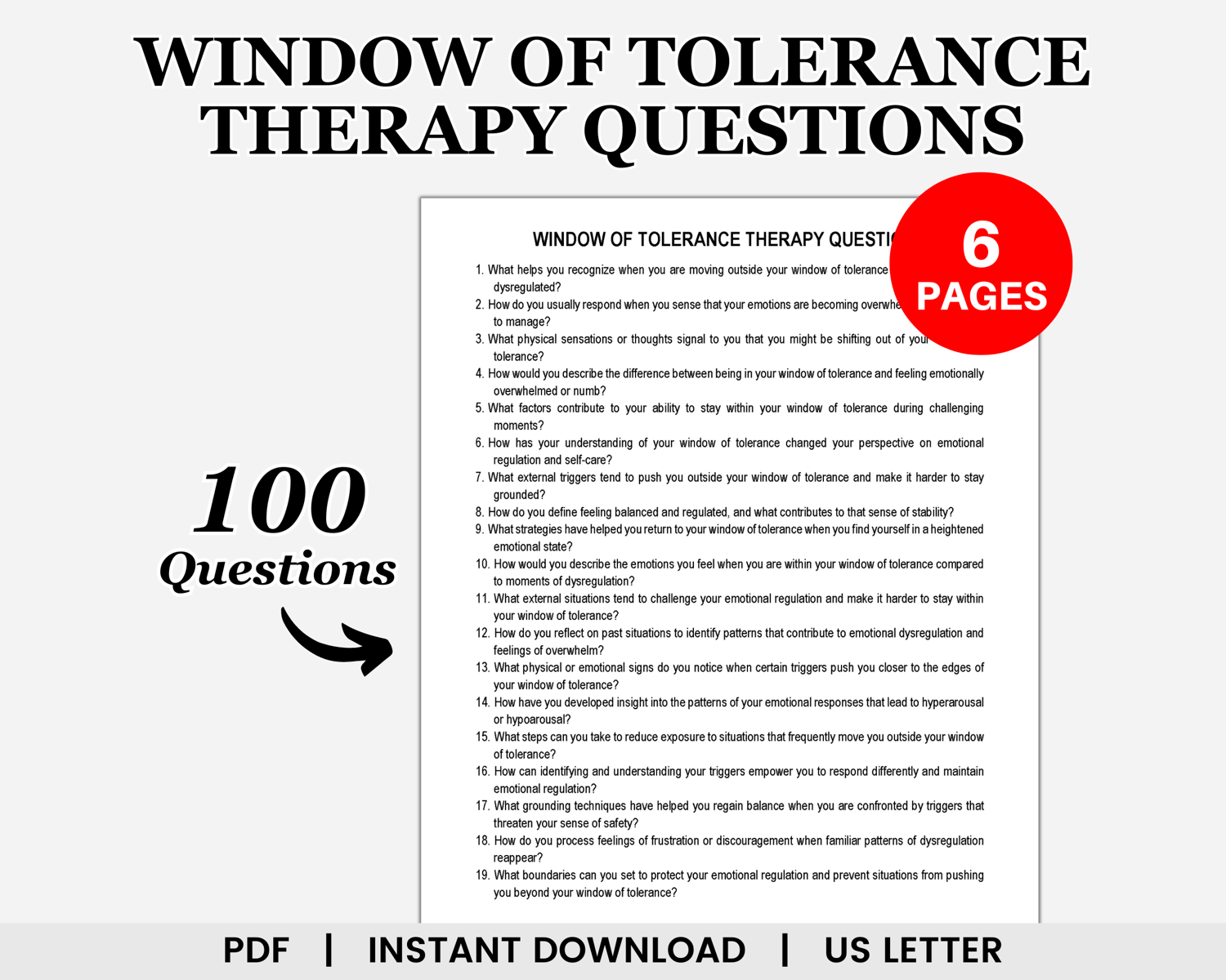 Designed to enhance client engagement and drive positive change, this therapy resource offers a collection of window of tolerance therapy questions. Tailored to the principles of trauma therapy, these therapy questions will guide your sessions towards productive conversations and transformative outcomes. These window of tolerance questions are made to elicit insightful responses and encourage clients to explore their goals and aspirations.