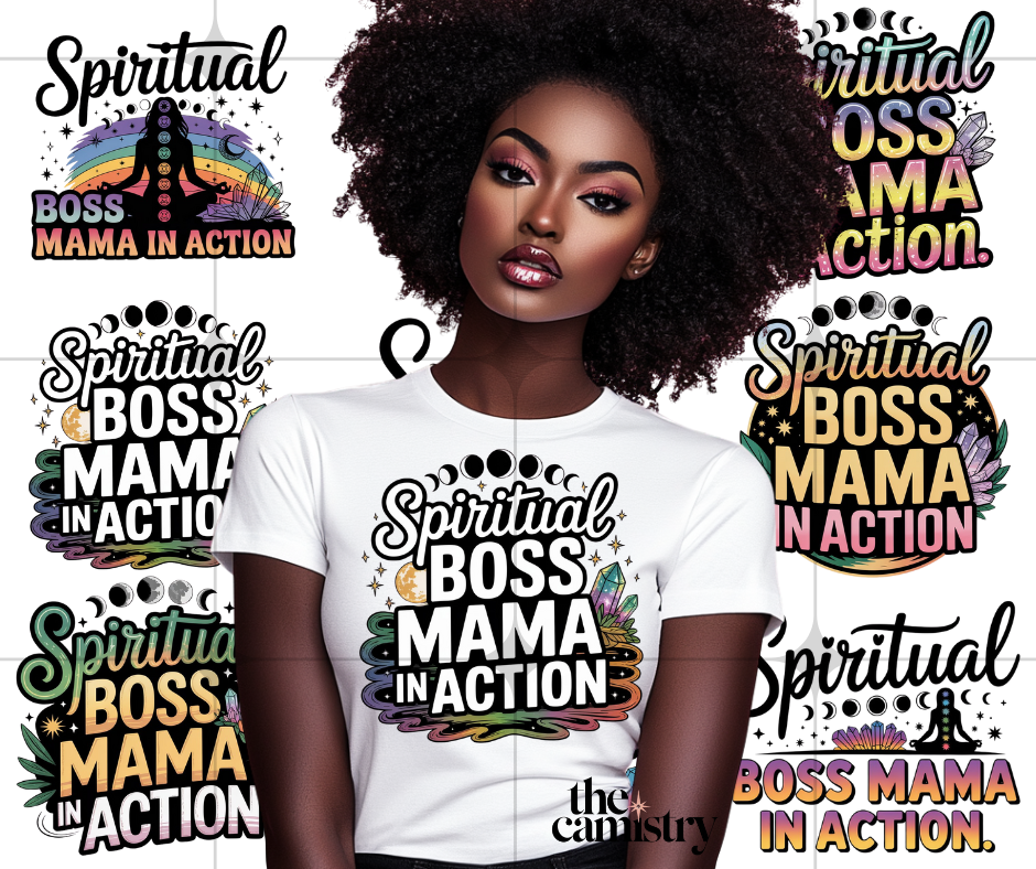 - 9 Complete “Spiritual Boss Mama in Action” PNG Designs: Moon-phase crowns, iridescent crystal clusters, swirling rainbow energy pools and twinkling stars—each composition is balanced, empowered and print-ready.