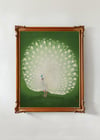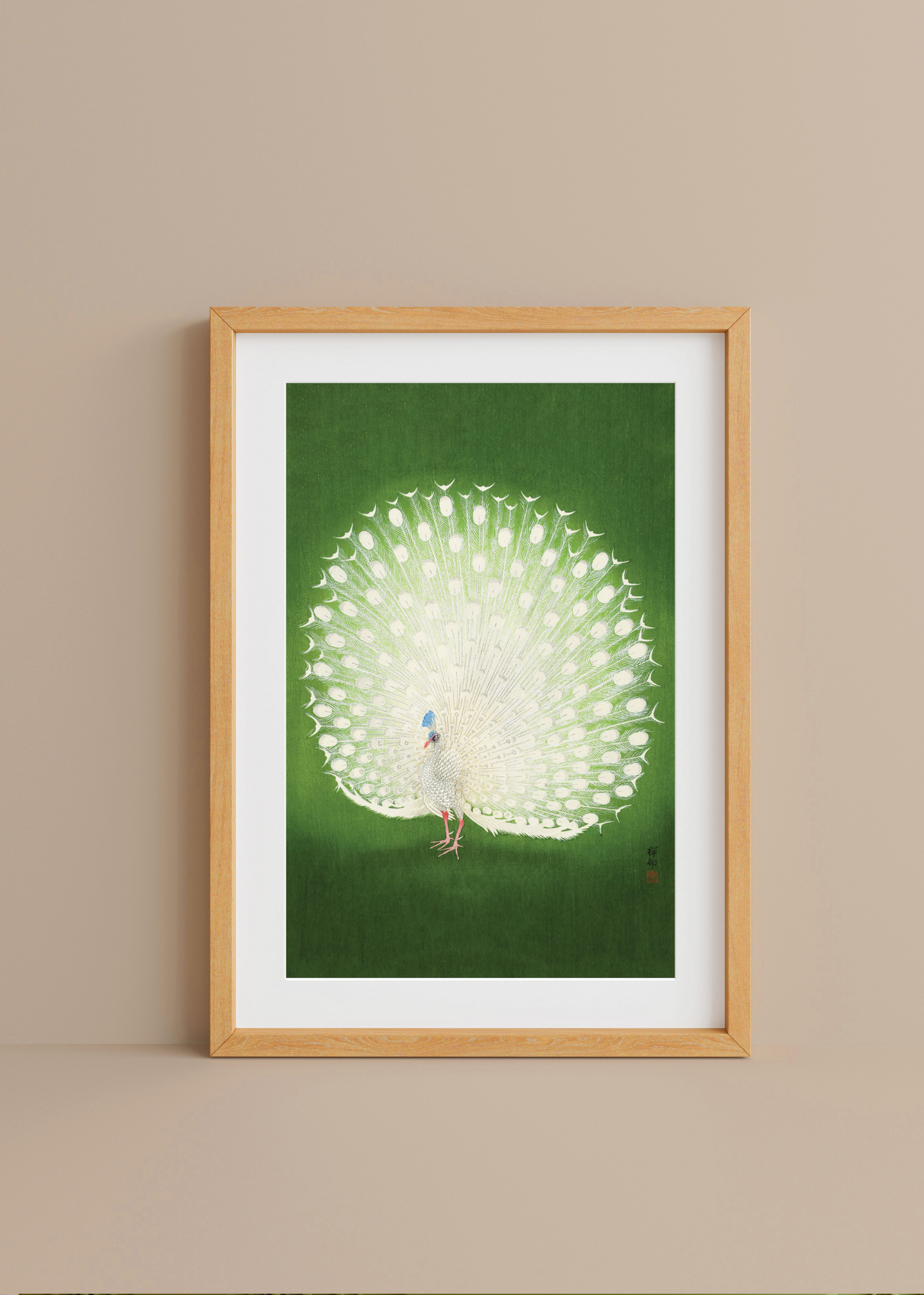 The composition is restrained yet radiant: a pale backdrop lets the plumage speak, each “eye” on the tail shimmering with secret knowing. His body curves like a painted river, every feather rendered with such precision it feels whispered into place. The eye of the bird, sharp and serene, gazes with calm detachment—as if aware of his own myth, and unbothered by it. “Peacock” is not a celebration of vanity, but of reverence—for the intricate, the ephemeral, the moments when nature chooses to dazzle. Koson offers not just an image, but a quiet exhale of wonder, where art and animal become one, luminous and eternal.