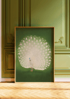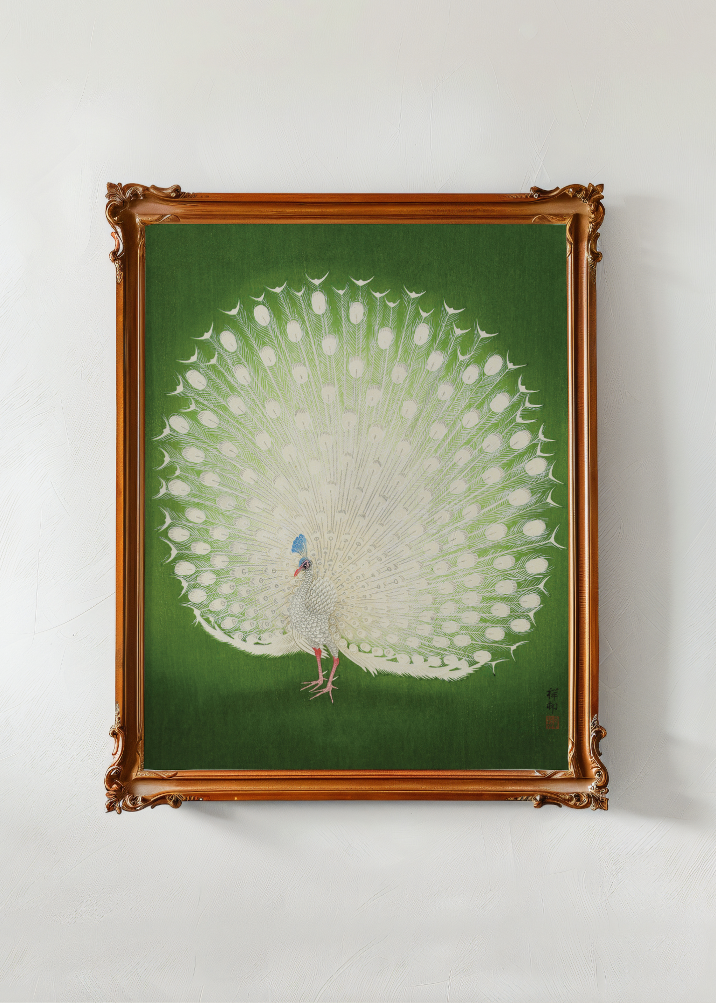 Peacock— He stands in quiet splendor, a living tapestry of emerald and sapphire, each feather a brushstroke of celestial geometry. The peacock, captured by Koson’s elegant hand, is not merely adorned in beauty—he embodies it, the embodiment of pride without arrogance, of poise born from stillness.
