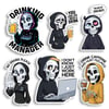 A playful sticker set featuring skeletons in hoodies with humorous quotes about work, caffeine, money, and drinks. Perfect for adding a dash of sarcasm to everyday life.