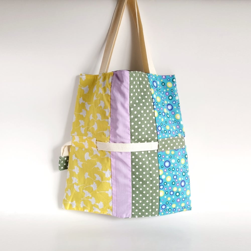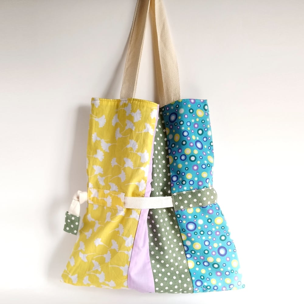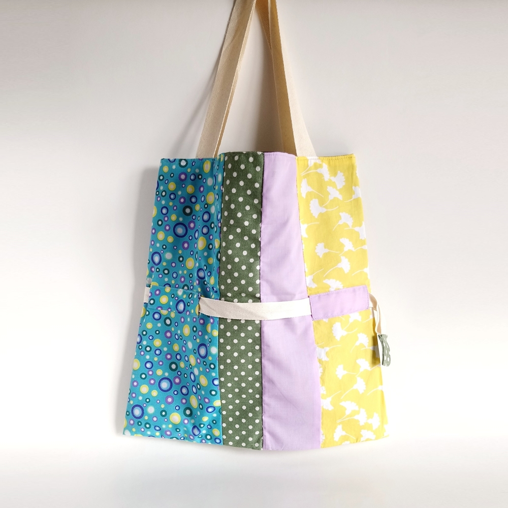 A tote bag made of long, colorful fabric strips of different widths is ideal in size and convenient for daily use or as a shopping bag.