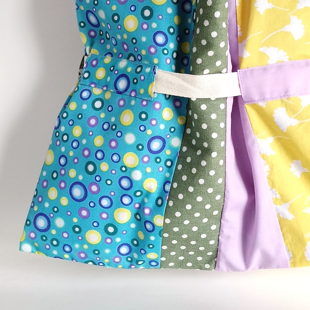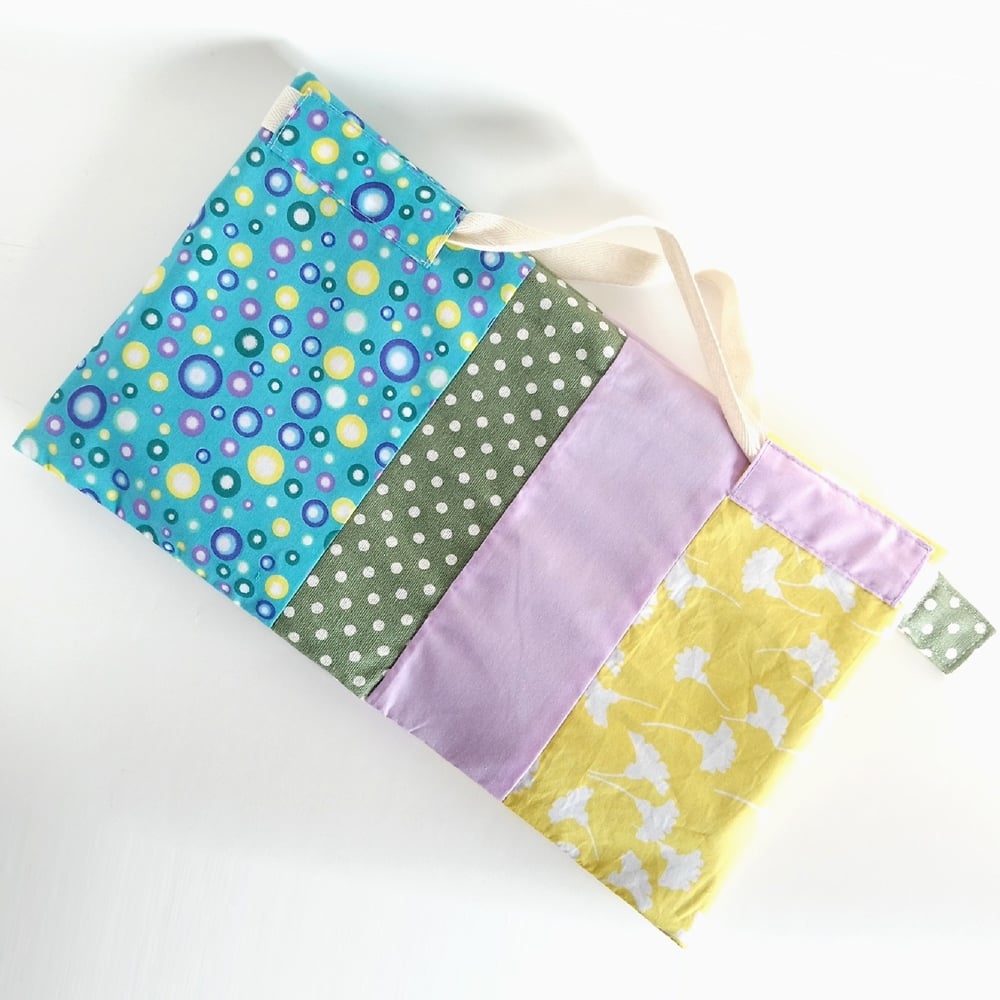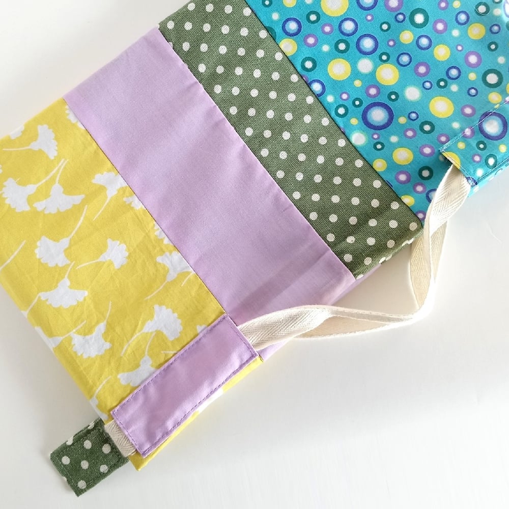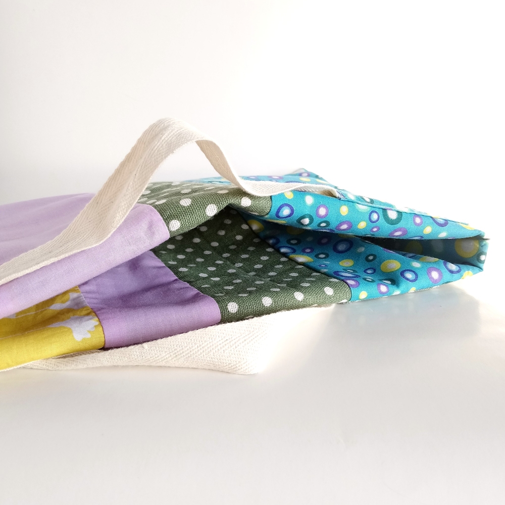 A tote bag made of long, colorful fabric strips of different widths is ideal in size and convenient for daily use or as a shopping bag.