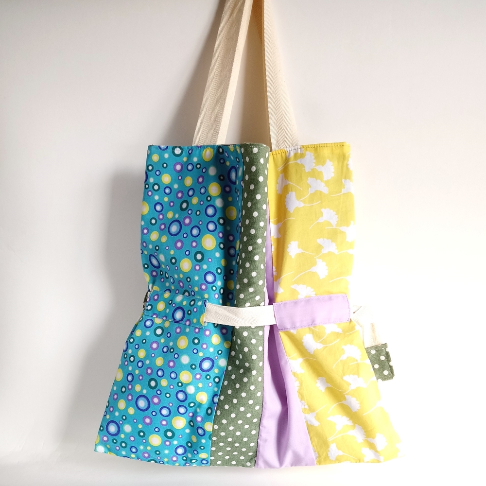 Finally, the tote bag can be turned over to the plain side to match the clothing for the day.