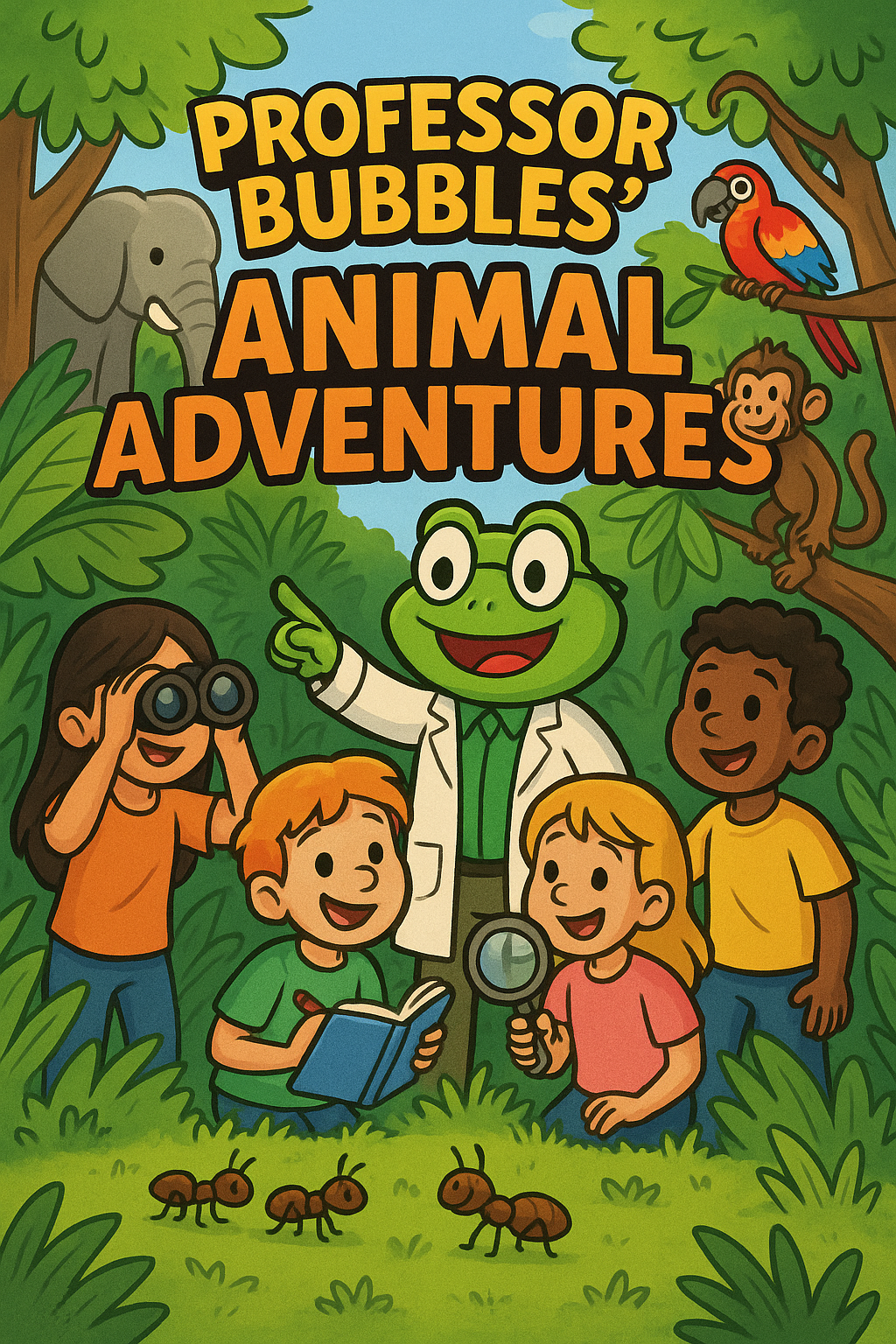 Join Professor Bubbles, the friendly frog scientist, and his young explorer friends—Liam, Sophie, Ethan, and Maya—as they travel across jungles, savannas, and oceans to discover the amazing world of animals.