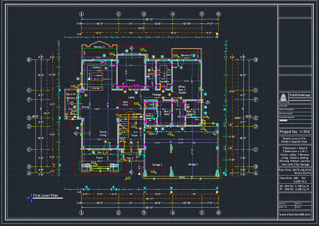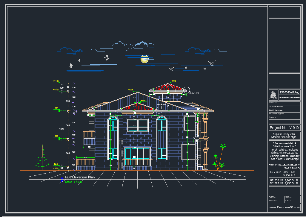 V-910| Modern Luxury Duplex Villa Plans – 5 Bedroom, 4 Living Rooms, 3-Car Garage