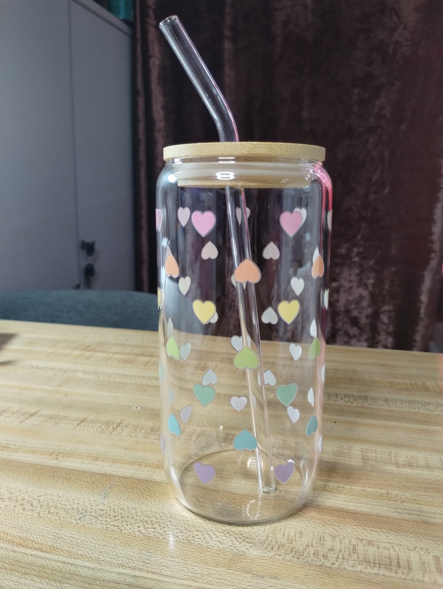 This colorful heart cup is 16oz it is glass with a glass straw.