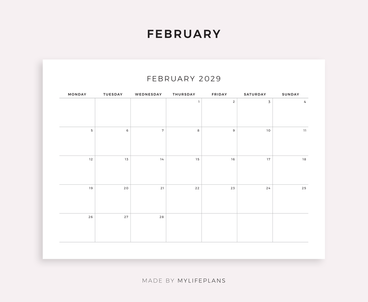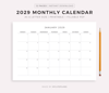 2029 Monthly Calendar, Landscape, Printable & Fillable, A4/Letter Size