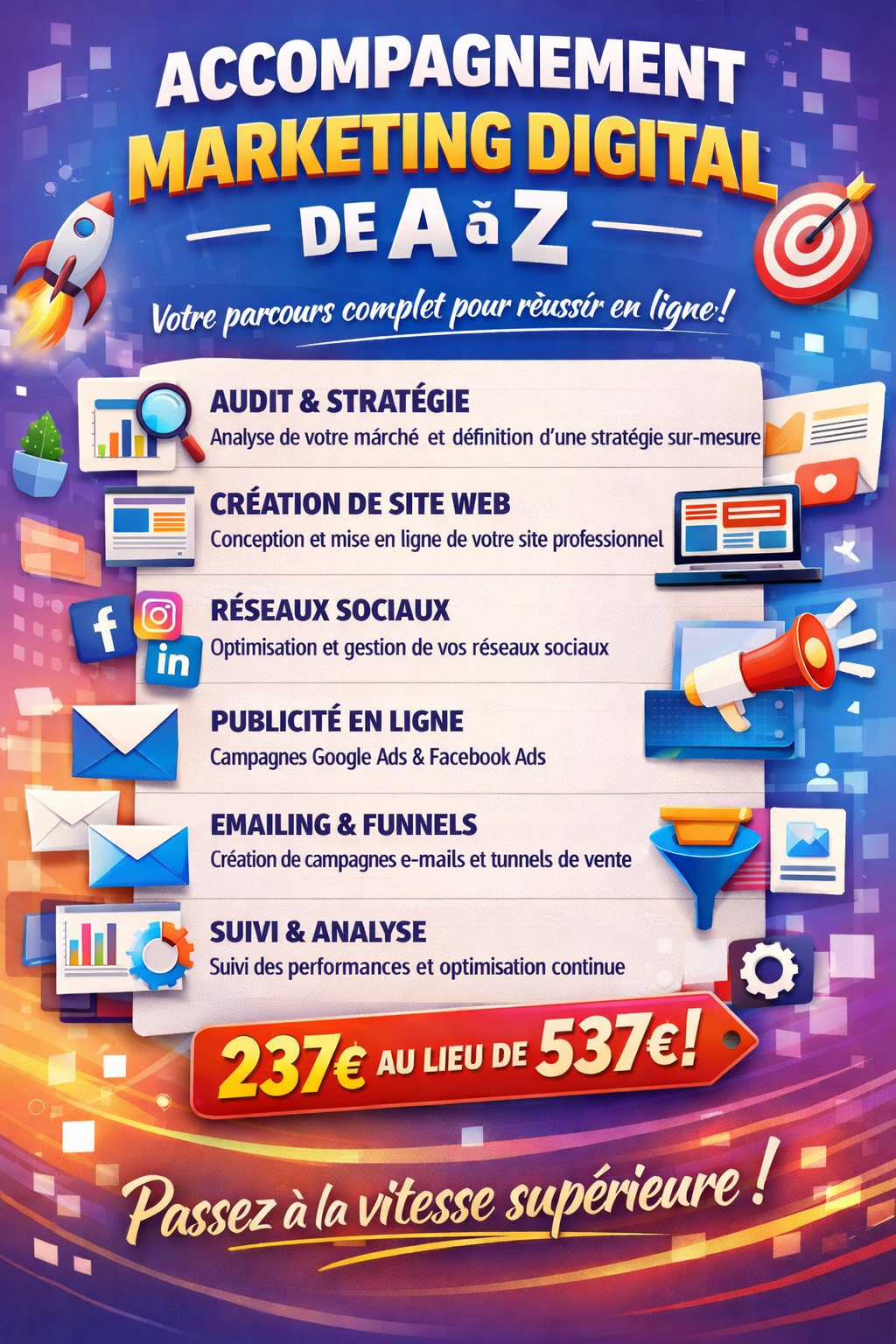 Mon accompagnement marketing digital de A à Z a été conçu pour celles et ceux qui veulent des résultats concrets, pas de la théorie inutile.