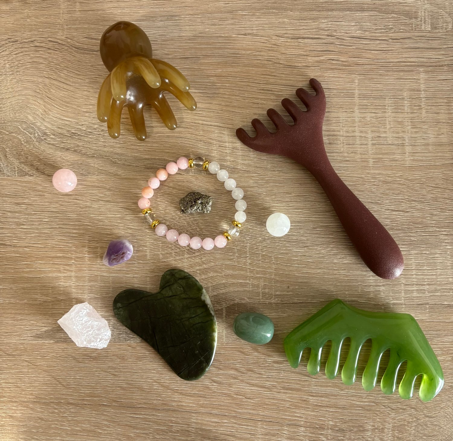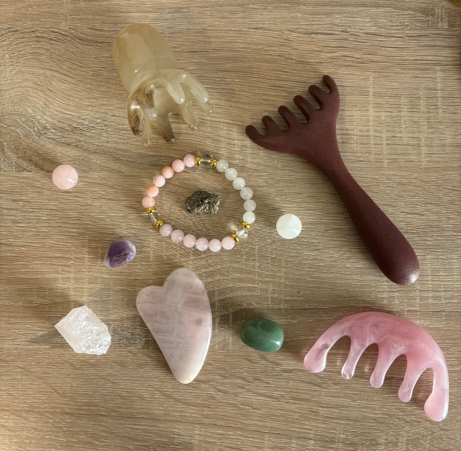 Dieses Selfcare-Edelstein-Paket besteht aus einer intuitiven Zusammenstellung der im Bild abgebildeten Produkte und kann euch helfen, eure Selbstliebe auf ein anderes Level zu bringen, wenn ihr euch der Sache annehmt.