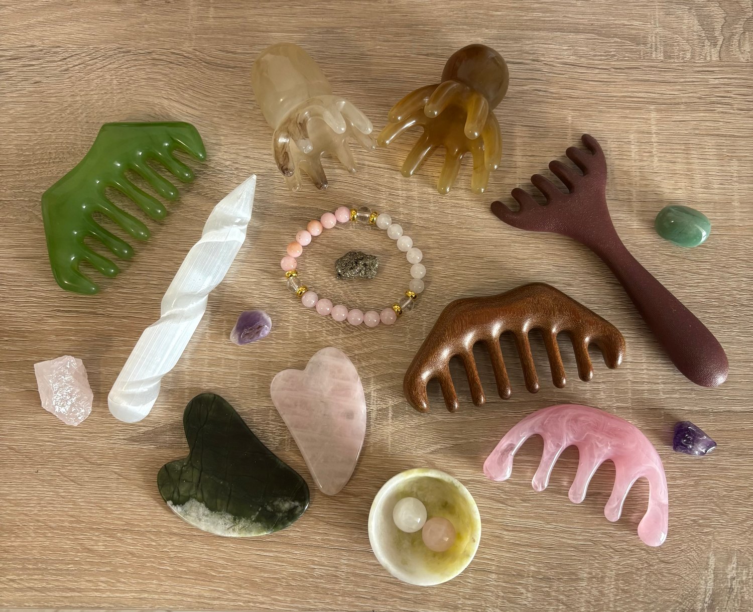 - Ein Kamm aus Edelsteinen oder Palo Santo Holz