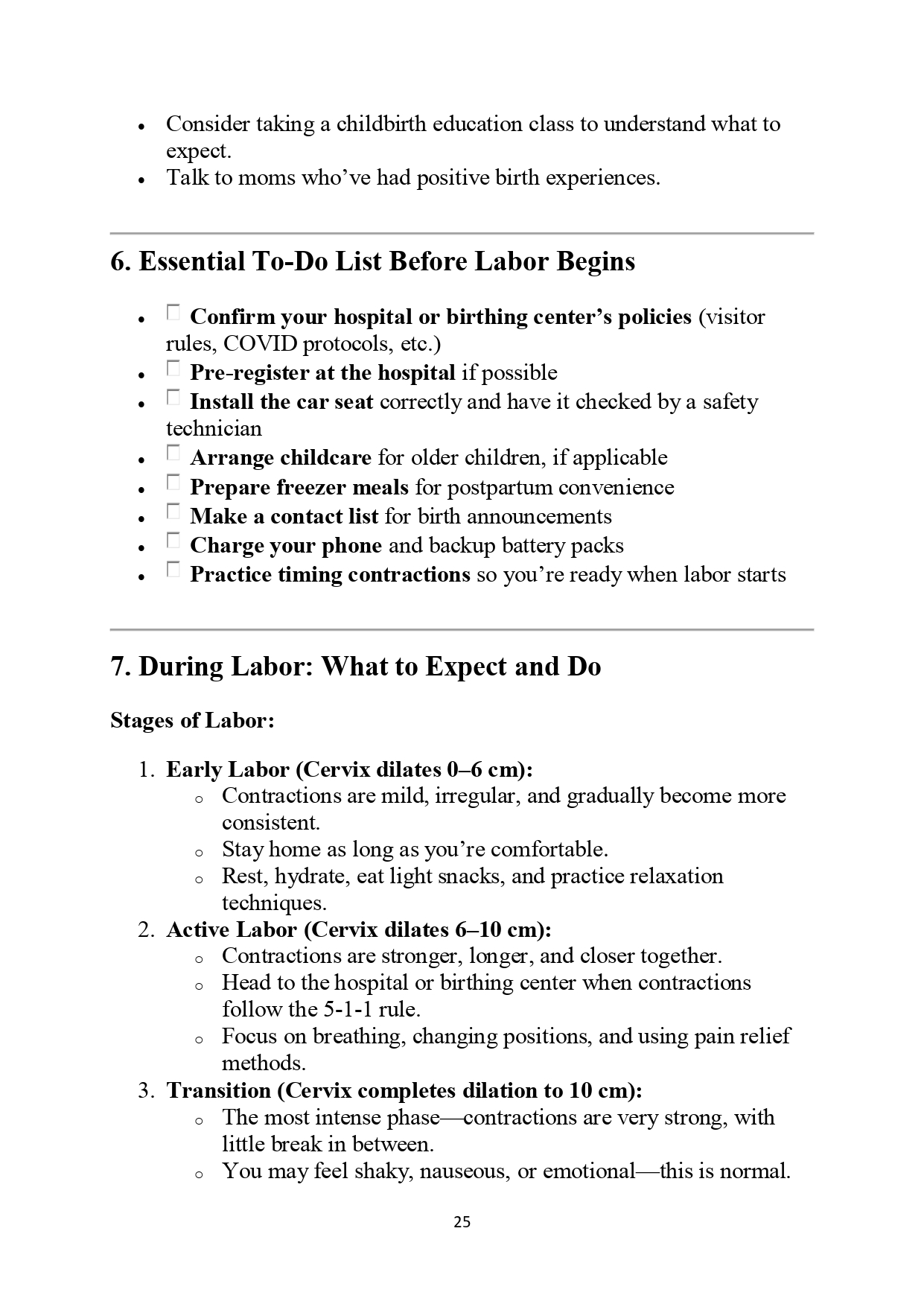 - Detailed Checklists: Tailored lists for each trimester, labor, delivery, and postpartum care, covering everything from medical appointments to packing your hospital bag.