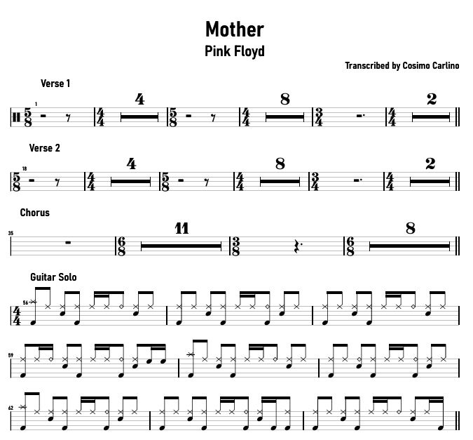 Mother - Pink Floyd - Full Drum Transcription in PDF
