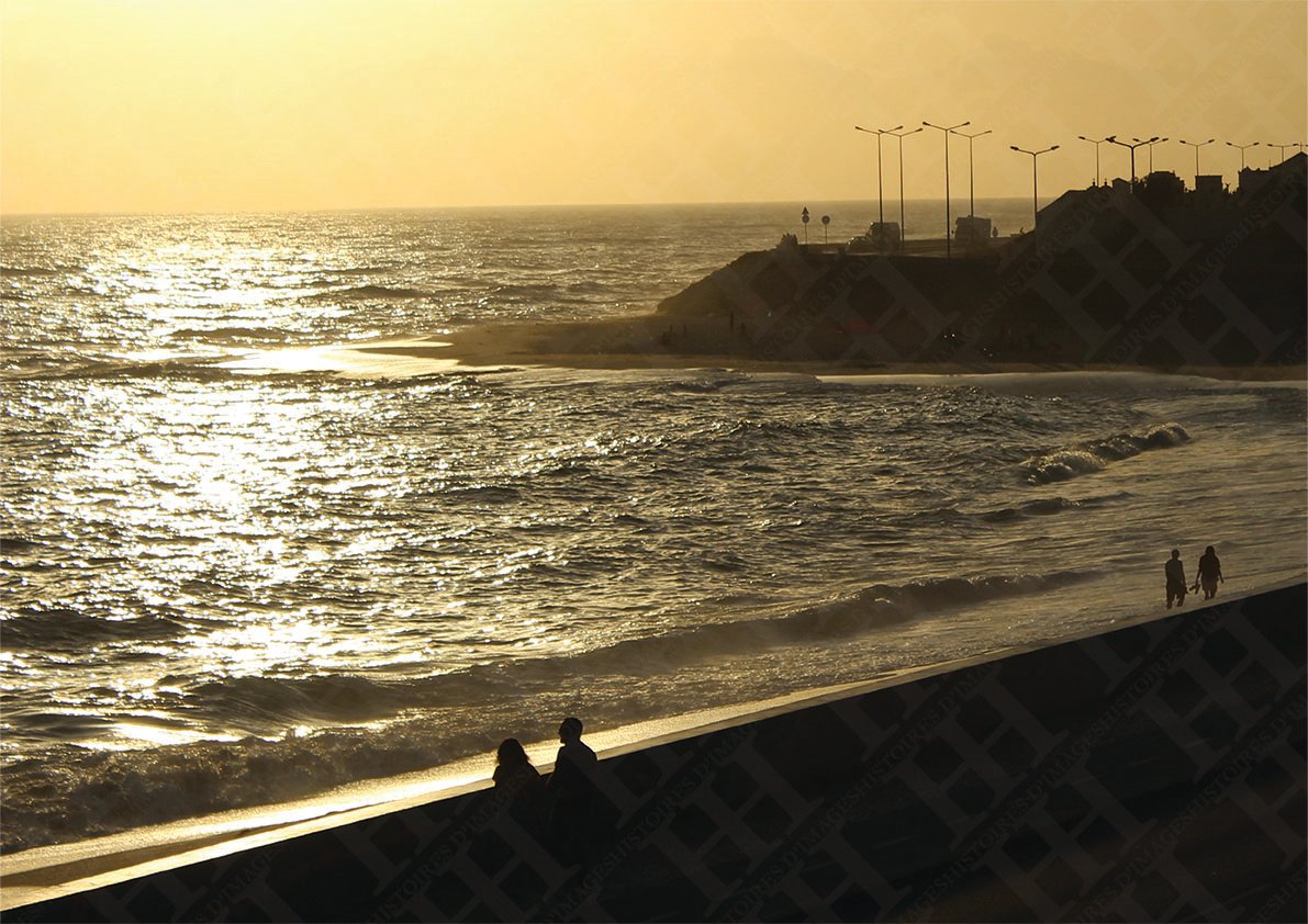View of the Atlantic from the Portuguese coast of Figueira da Foz. The golden sea hugs the banks, and their daily life creates a relaxed and lazy summer atmosphere.