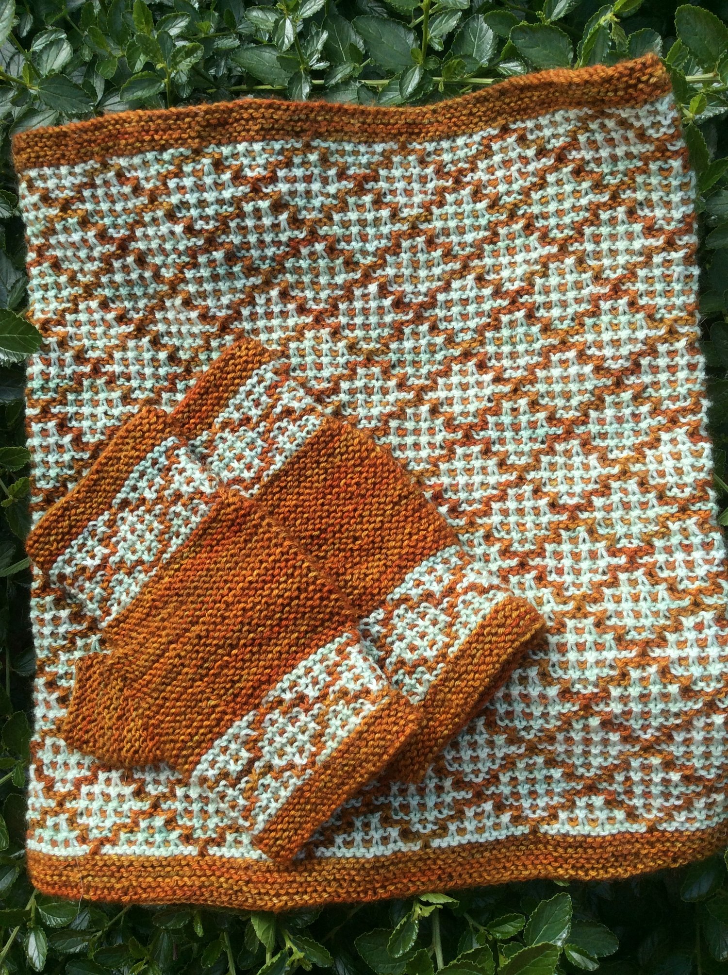 To make the Claxby Cowl and fingerless Mitts you will need two 100 gm balls of 4 ply (each ball = 410 metres), a set of four 3mm double pointed needles and one 3mm circular needle 60 cm long. I used Wool is the Answer yarns with “Russett” as the main shade contrasted with “Pale Forest Green“ (www.woolistheanswer.co.uk)
