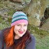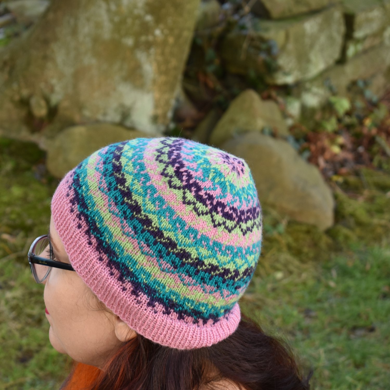 Gran Loves hugs is a stranded colorwork beanie. Using 4 colors, this hat is worked in the round from the bottom up. The decreases are written into the chart. Instructions for this hat are written for the cast on, but after the brim, the instructions are charted only. It’s a quick knit, and the patterns are easy to memorize. Recommended ease for this hat is 1-2” inches of negative ease. I originally designed this hat as a gift for my mother-in-law. The encoded message for her is in the title.