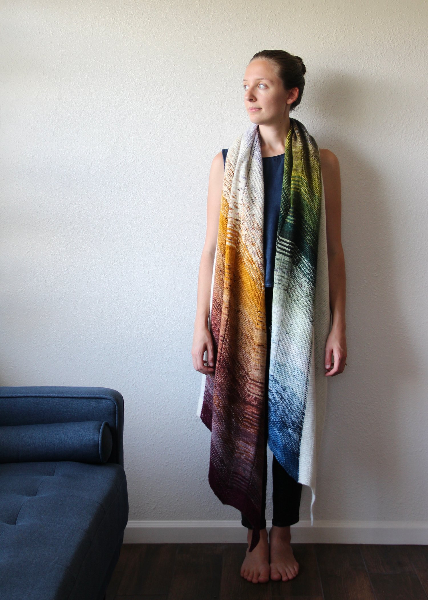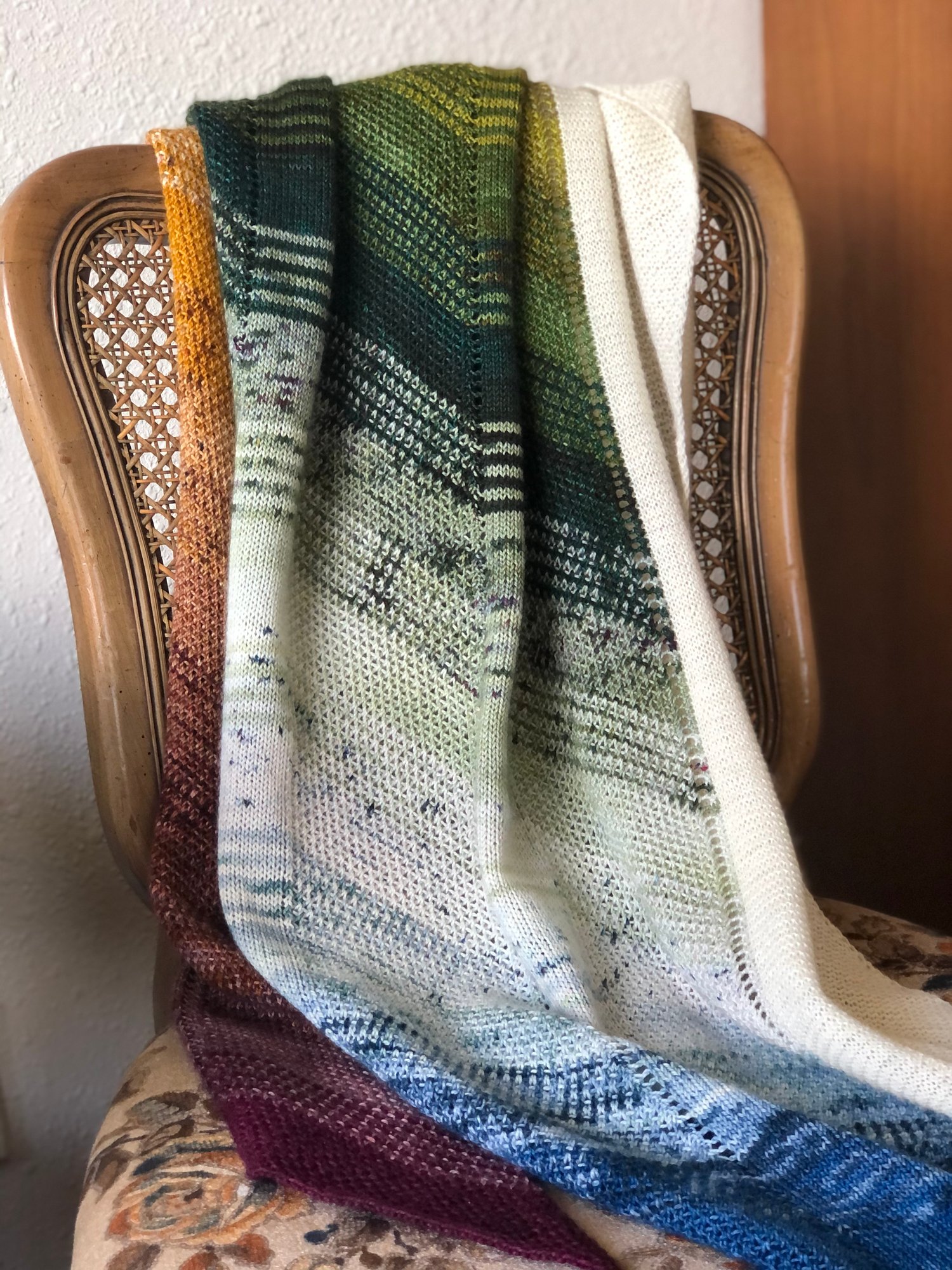 Arda, the world in which The Silmarillion and Lord of the Rings takes place, seemed the perfect name for this shawl pattern, which was knit using Lord of the Rings inspired yarn and provides a world of creative possibilities. Bias knitting provides the perfect blend of simplicity and engaging knitting, while an easily memorizable two-row pattern repeat is simple enough for mindless knitting and engaging enough to keep you knitting. The eyelet moss stitch also creates a lovely open texture without being too hole-y while also being the perfect stitch pattern for blending subtle fades. With instructions for a large and small shawl as well as a scarf version, Arda is sure to become a staple of your wardrobe, whichever size you choose to knit.