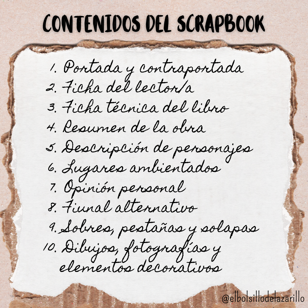 Dado su gran componente visual, el scrapbook tiene que ser atractivo a la vista y mostrar la información de forma limpia y ordenada. Deberá incluir fundamentalmente elementos visuales, pero también texto, ya que se debe describir y comentar la lectura. Es un instrumento especialmente útil para fomentar la creatividad y expresión plástica del alumnado.