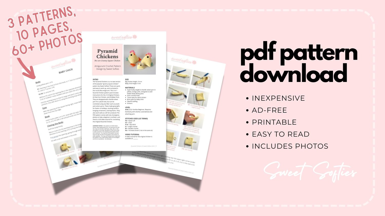This 3-in-1 Pyramid Chicken pattern pack includes instructions for the: