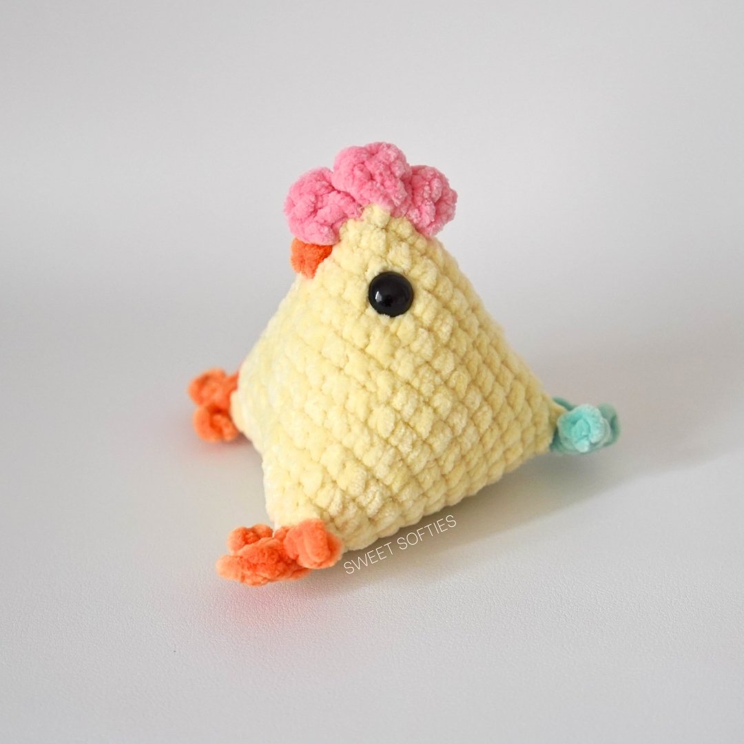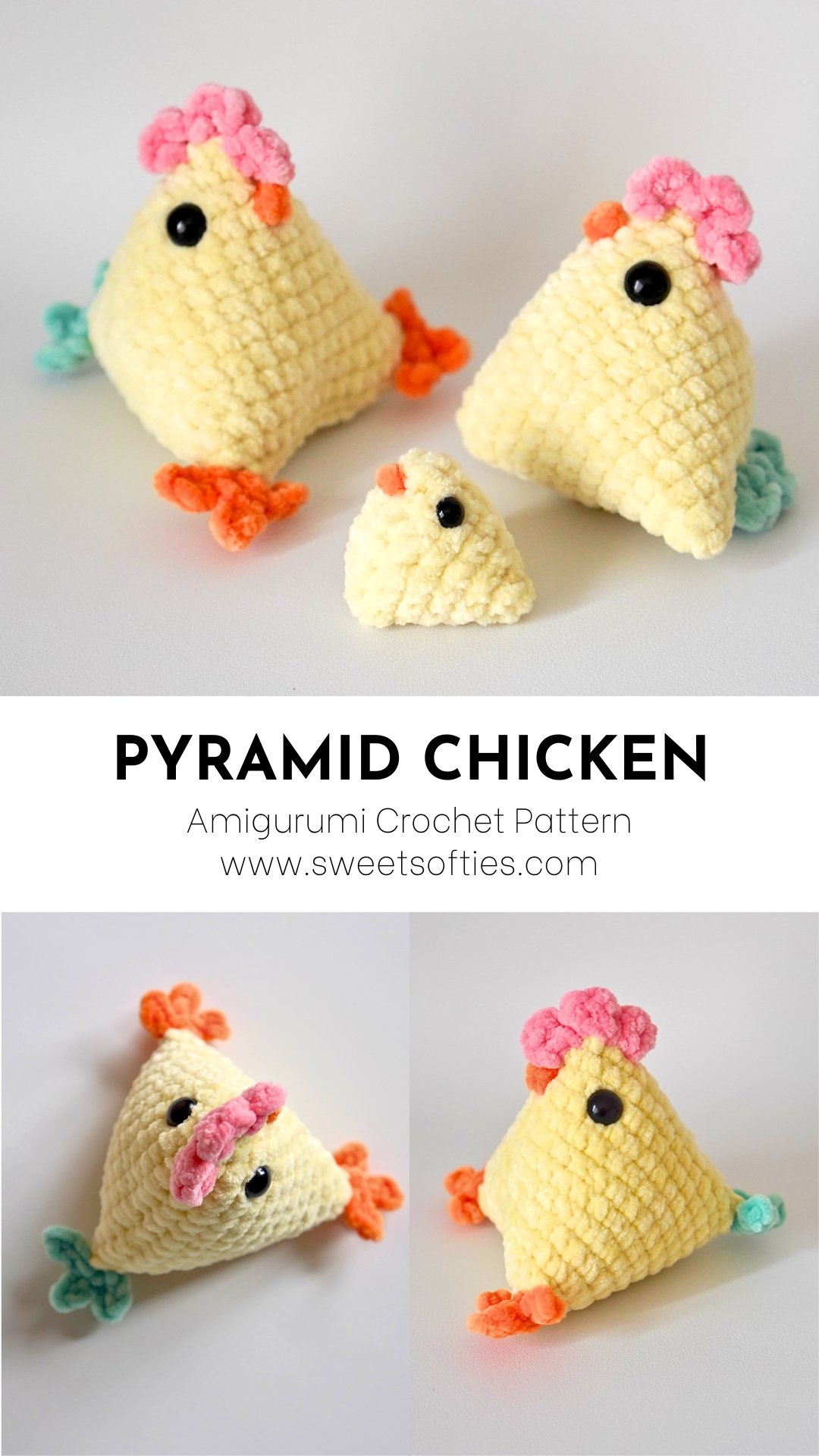 Free version of the pattern (Original Pyramid Chicken only) viewable at: https://www.sweetsofties.com/2025/11/pyramid-chicken.html