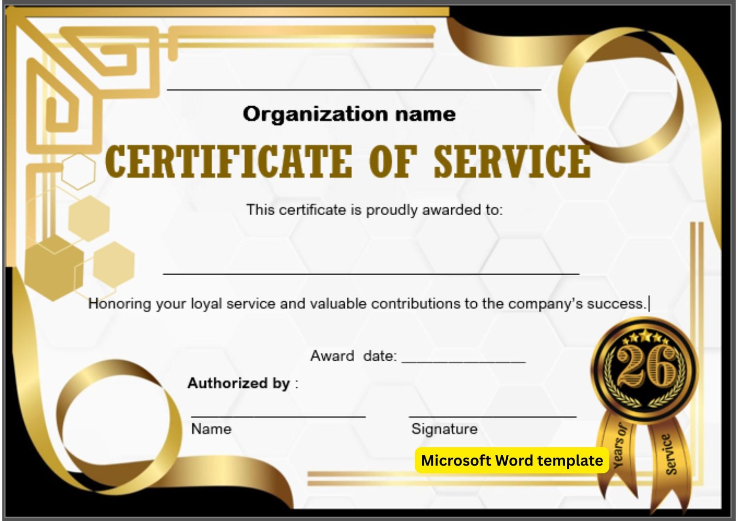Elegant digital Microsoft Word certificate template. Perfect for recognizing excellence and celebrating achievements. Easy to customize – you can change the award title, edit any text, and personalize names. This design comes in various versions, including Years of Service (1–47 years), Employee of the Month Appreciation, Best Supervisor Recognition, Certificate of Achievement – Top Performer, Certificate of Excellence – Best Seller, and Employee of the Year.