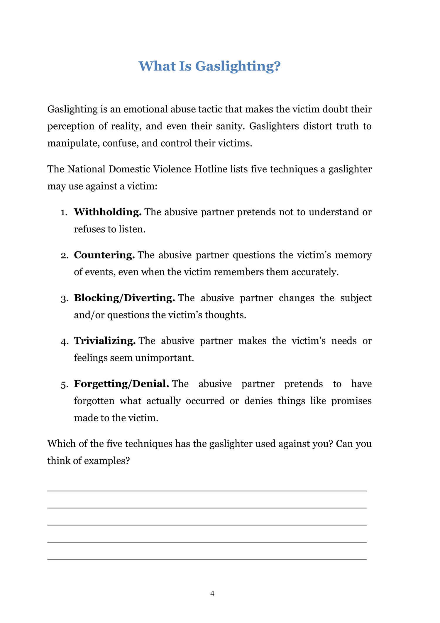 +15 Pages of activities and prompts to help you overcome gaslighting and stop tolerating it.