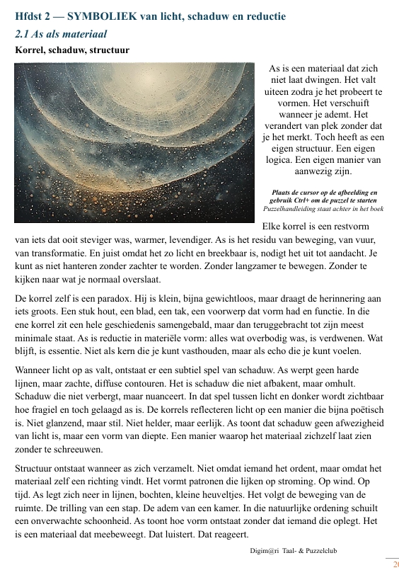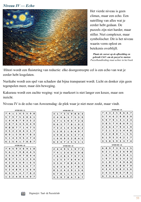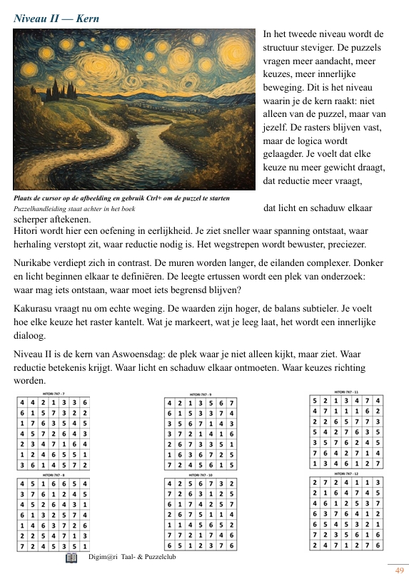 een zorgvuldig geschreven e‑book vol reflectie, symboliek en rust, aangevuld met een complete puzzelcollectie (Hitori, Nurikabe en Kakurasu) én zeven exclusieve Digimari‑posters die je direct kunt printen.