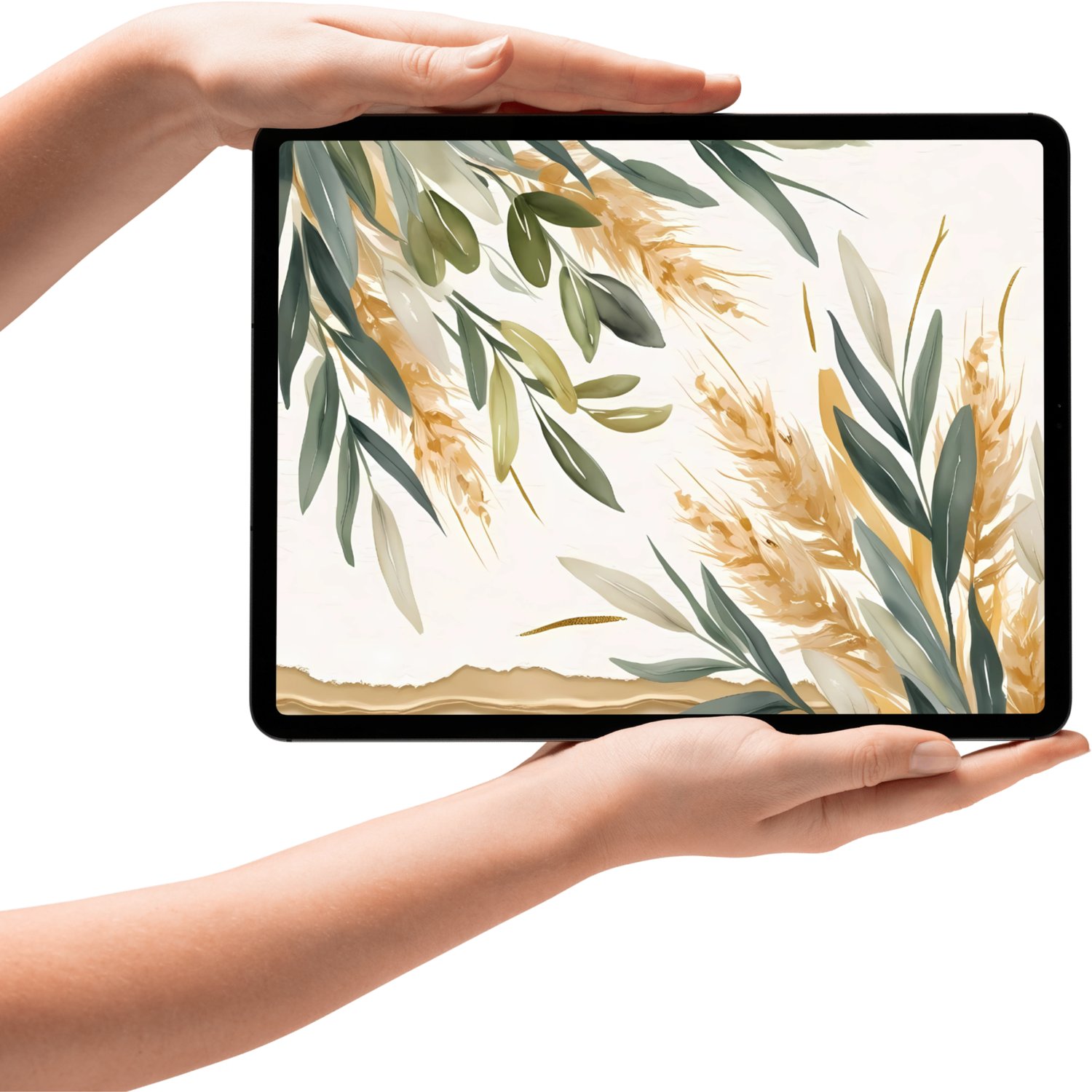 Elevate your creative projects with this set of 24 watercolor botanical backdrops, featuring earthy tones and delicate botanical elements such as olive branches, dried pampas grass, eucalyptus, wildflowers, fern leaves and more.