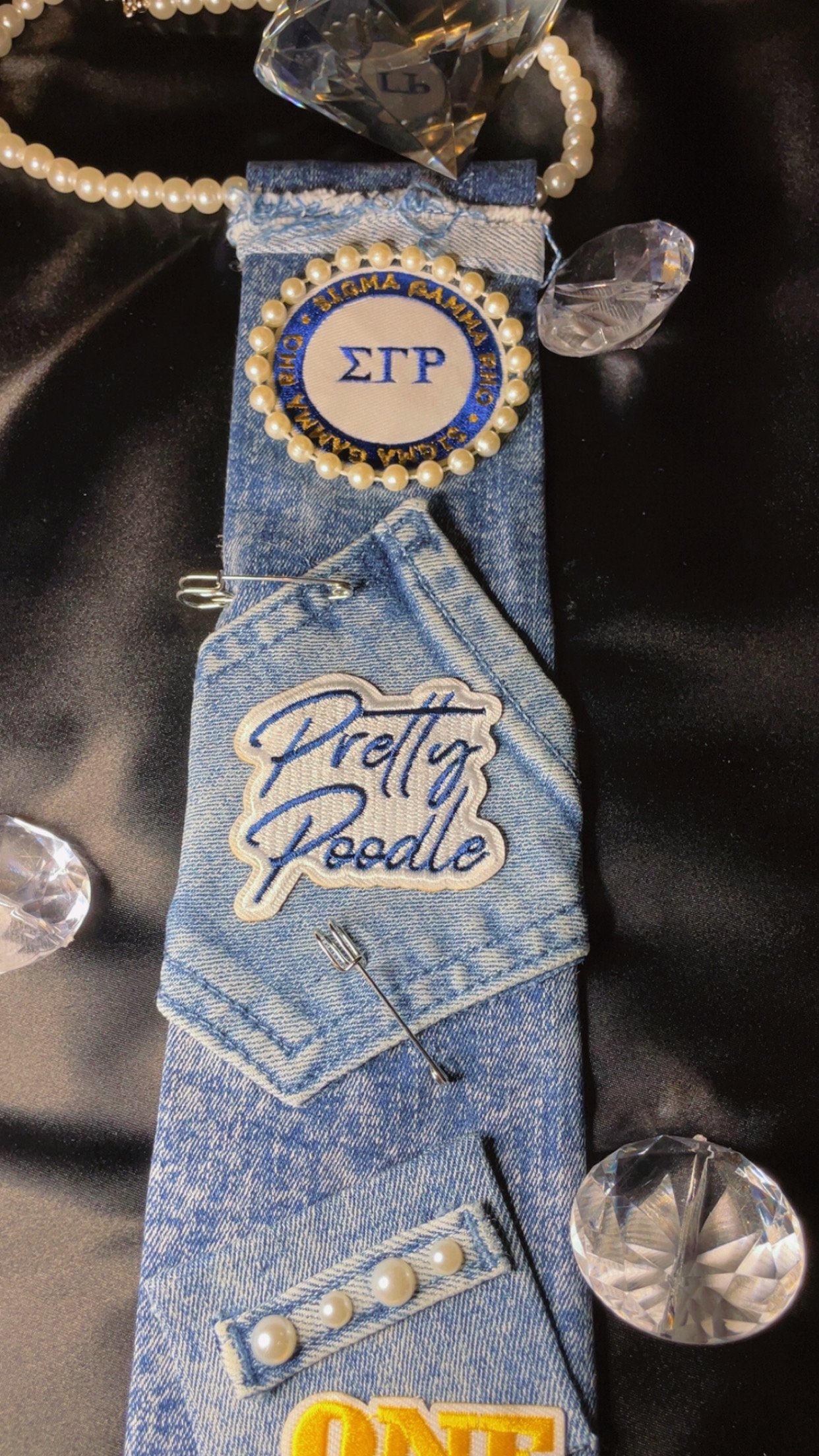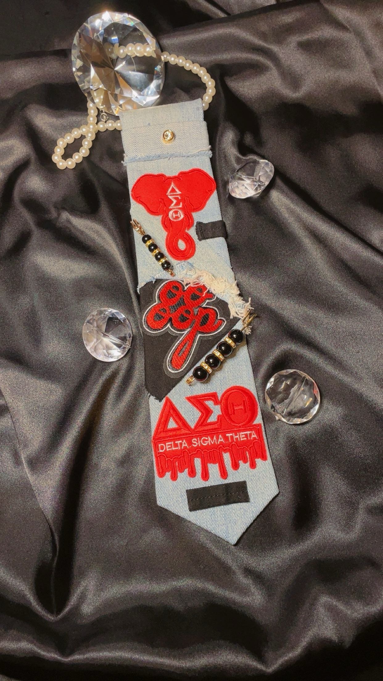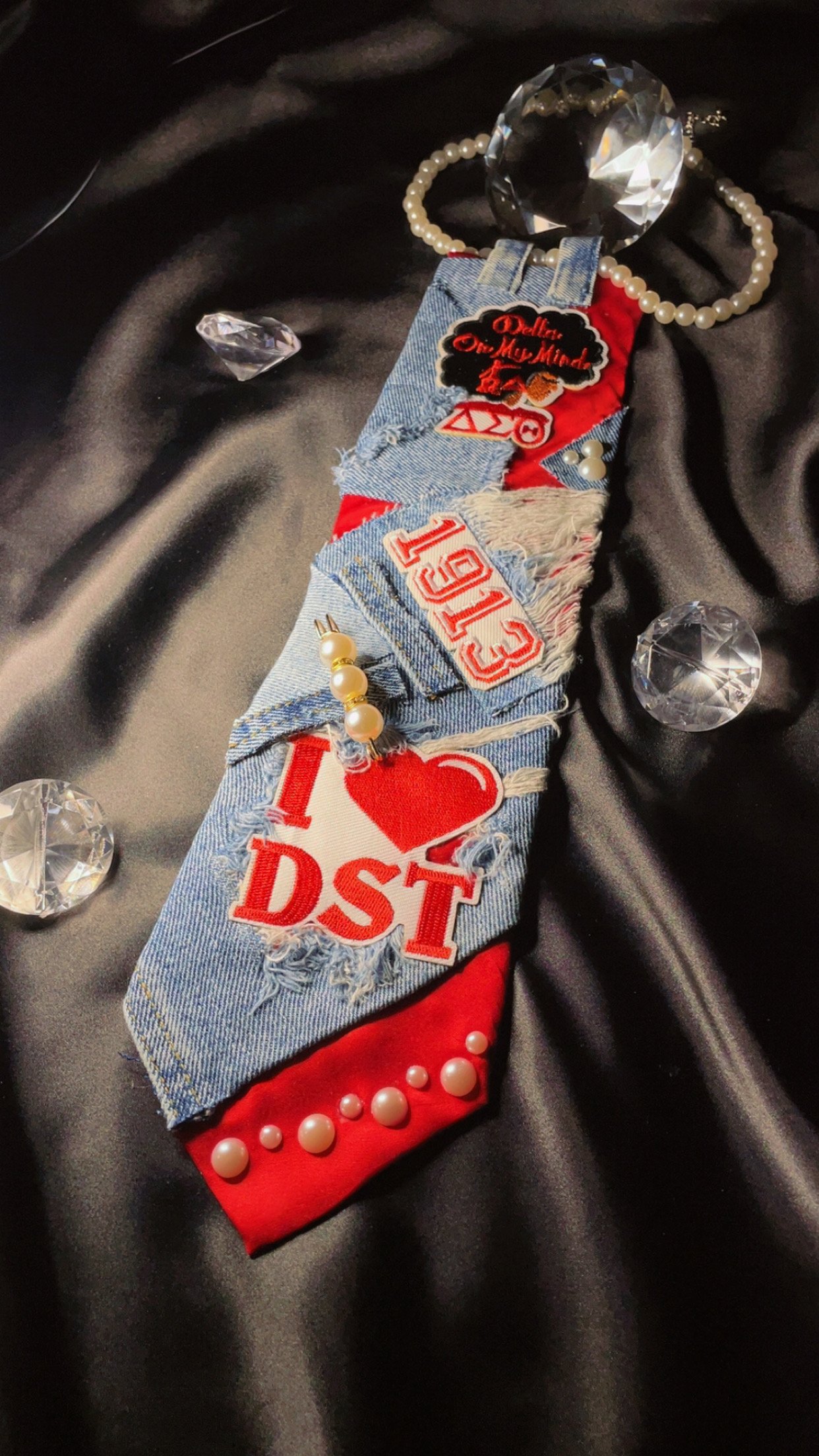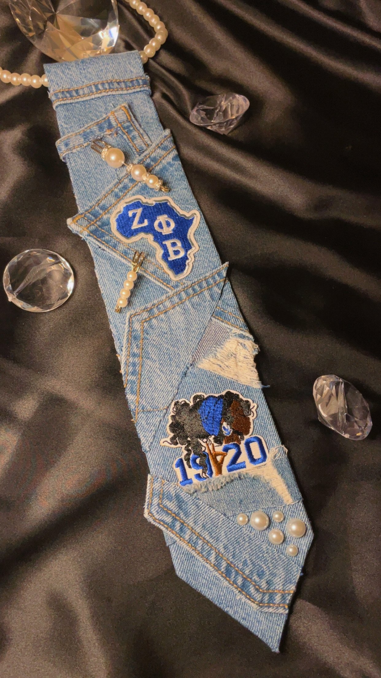 Crafted from reclaimed denim and layered with purpose, this piece honors every woman who carries her letters with pride. Finished with pearl accents and signature sorority patches, it’s a bold reminder that sisterhood is strength — and every bond has a story.