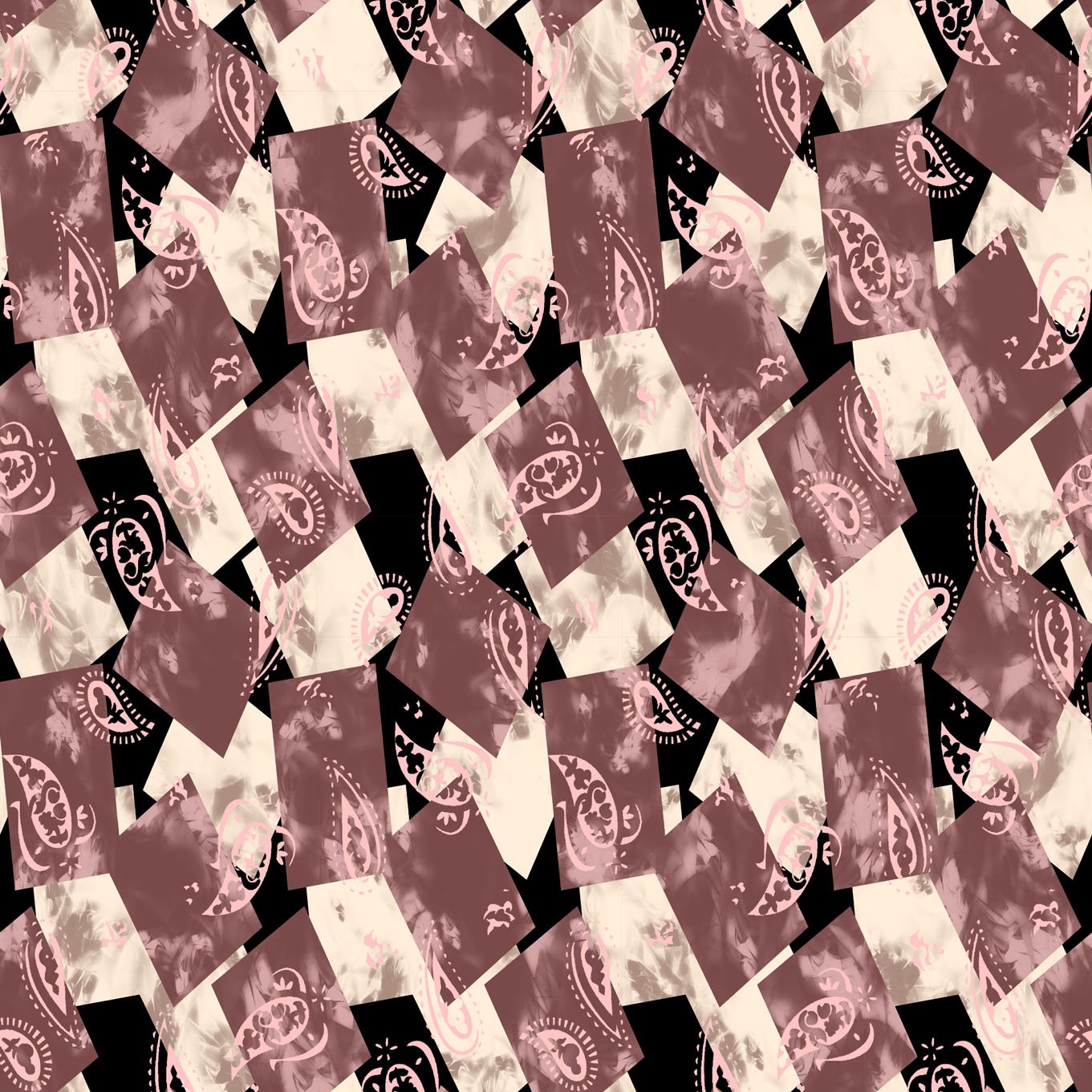 Overlapping rectangles with tie-dye & paisley textures in maroon, beige & black