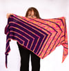When knitted in bright strong colours the pattern and colour change creates dramatic definition and contrast, making this a bold statement shawl, but you could create a softer look by using colours that are more similar. Resist the temptation to choose yarns that compliment each other because they share colours in common as the pattern will be lost.