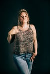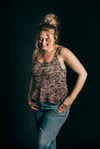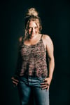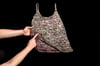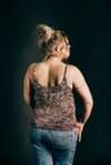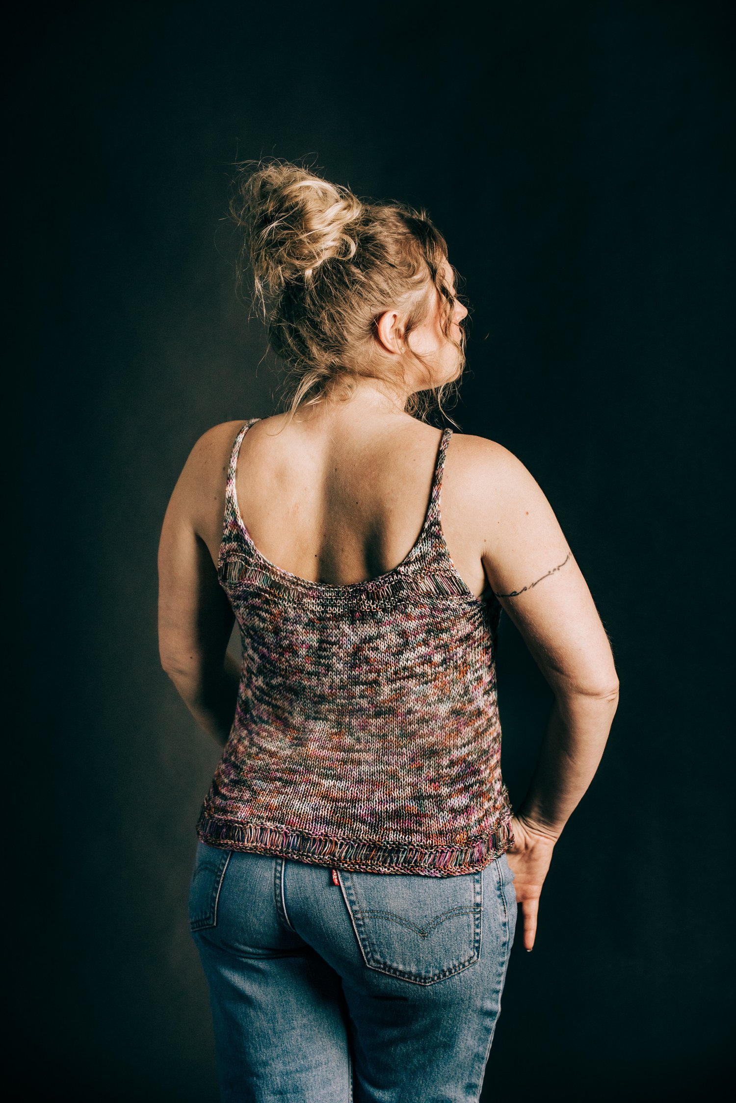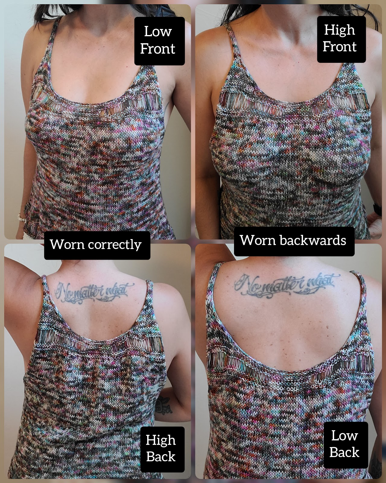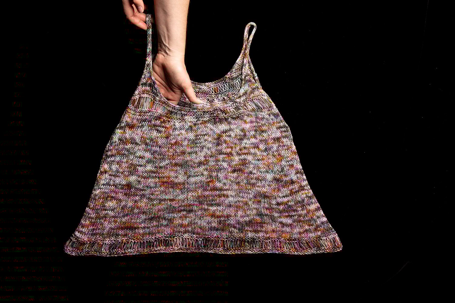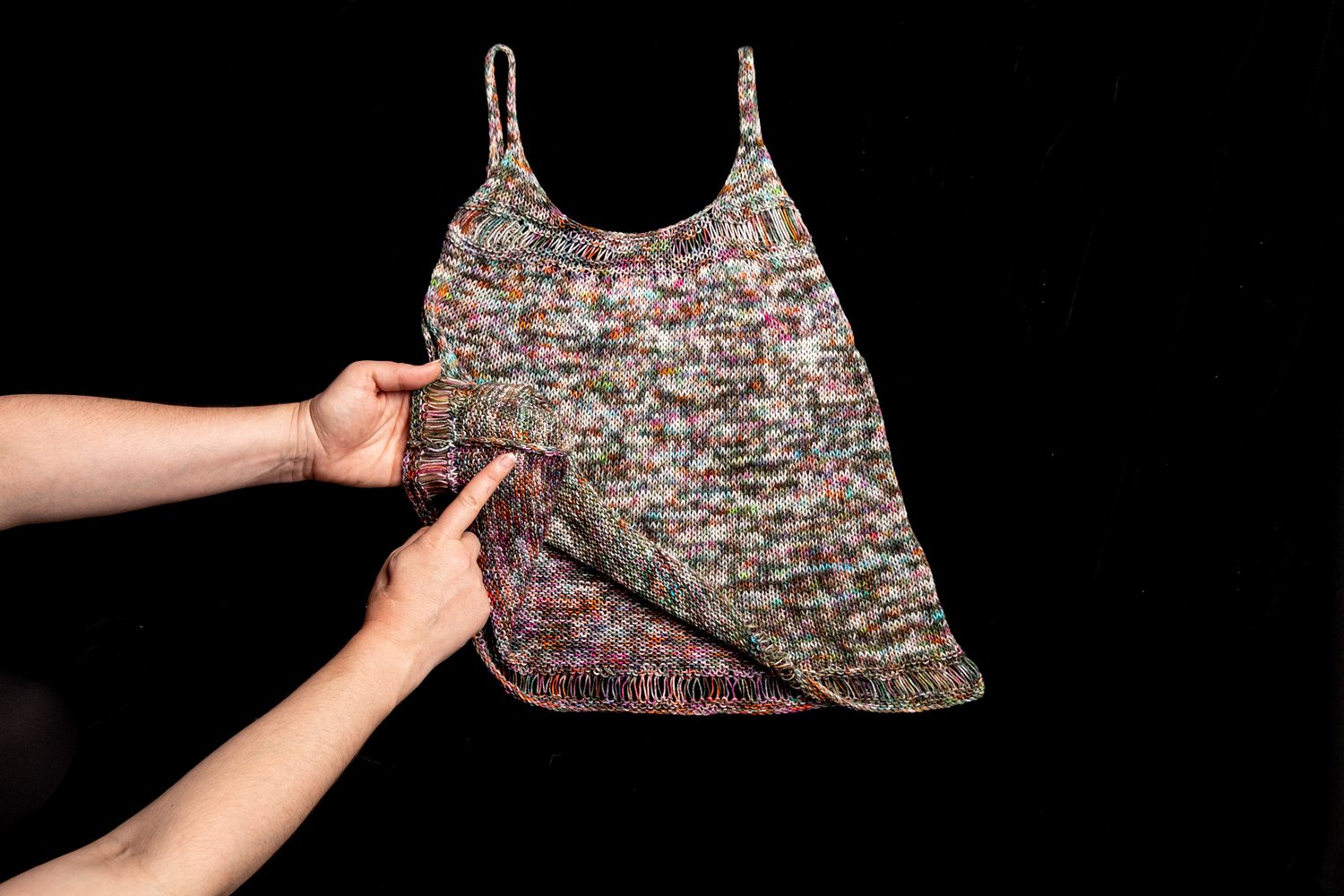 The Soundwave Tank is knit in two separate pieces. Dropped yarn overs run along the bottom hemline. Different sized yarn overs form a gradual curved line. It is reversible as well. One side will give a low cut effect, while the other side will be more modest. As seaming is being completed, adjusting the depth of the underarm can give a varying effect. There are two options available for the straps.