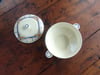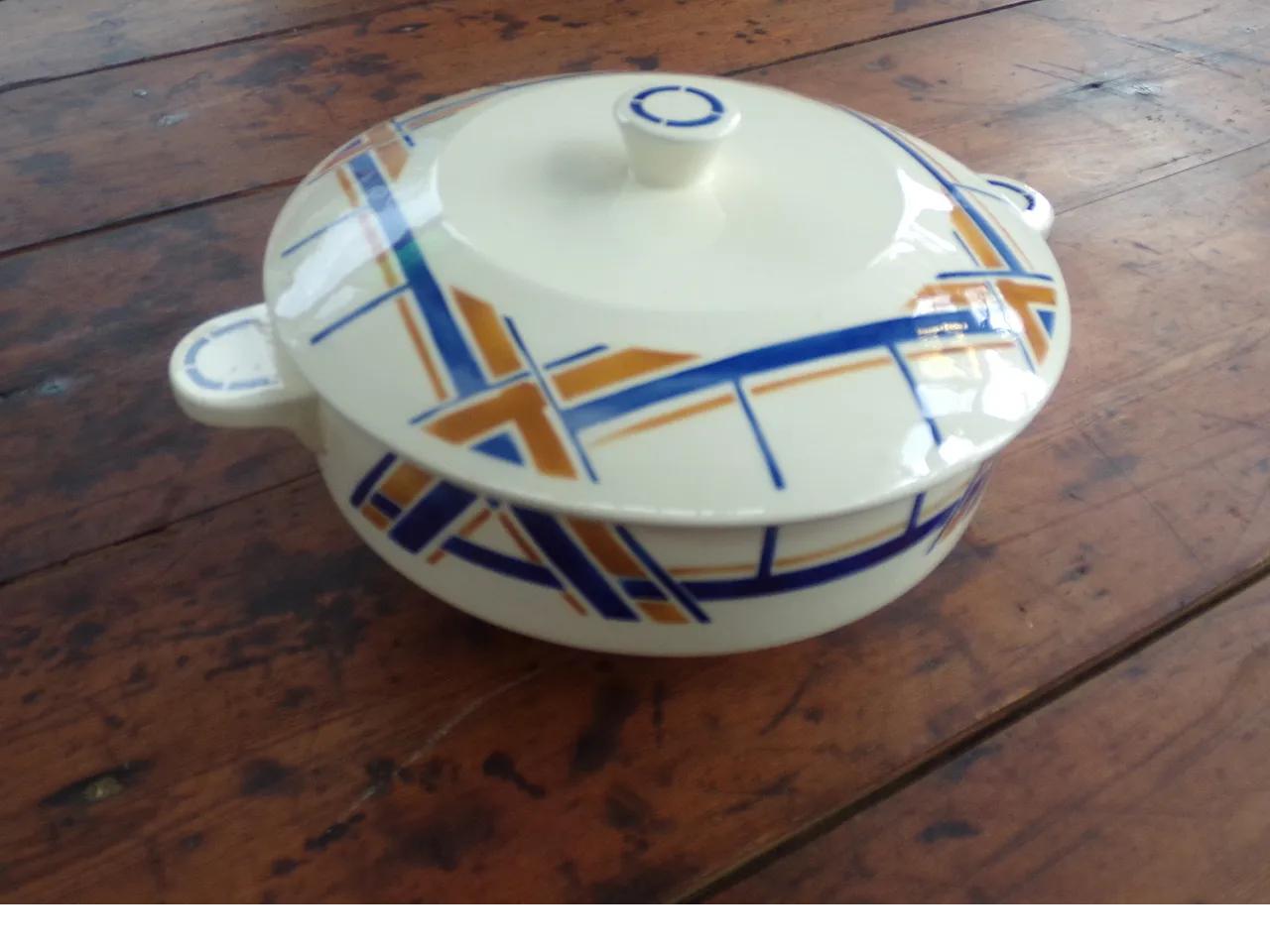 Antique Soup Tureen with cover, in Orange and Blue stripes geometric motif, white/cream background, made of ironstone, by Badonviller factory, stamped, rare 'Elboeuf' model, 1920-30s period. Dim: 16x23x27 cm. good vintage condition – no chips, no cracks. Additional up-to-date photos and details available upon request. Vintage items may show signs of slight wear due to their age.