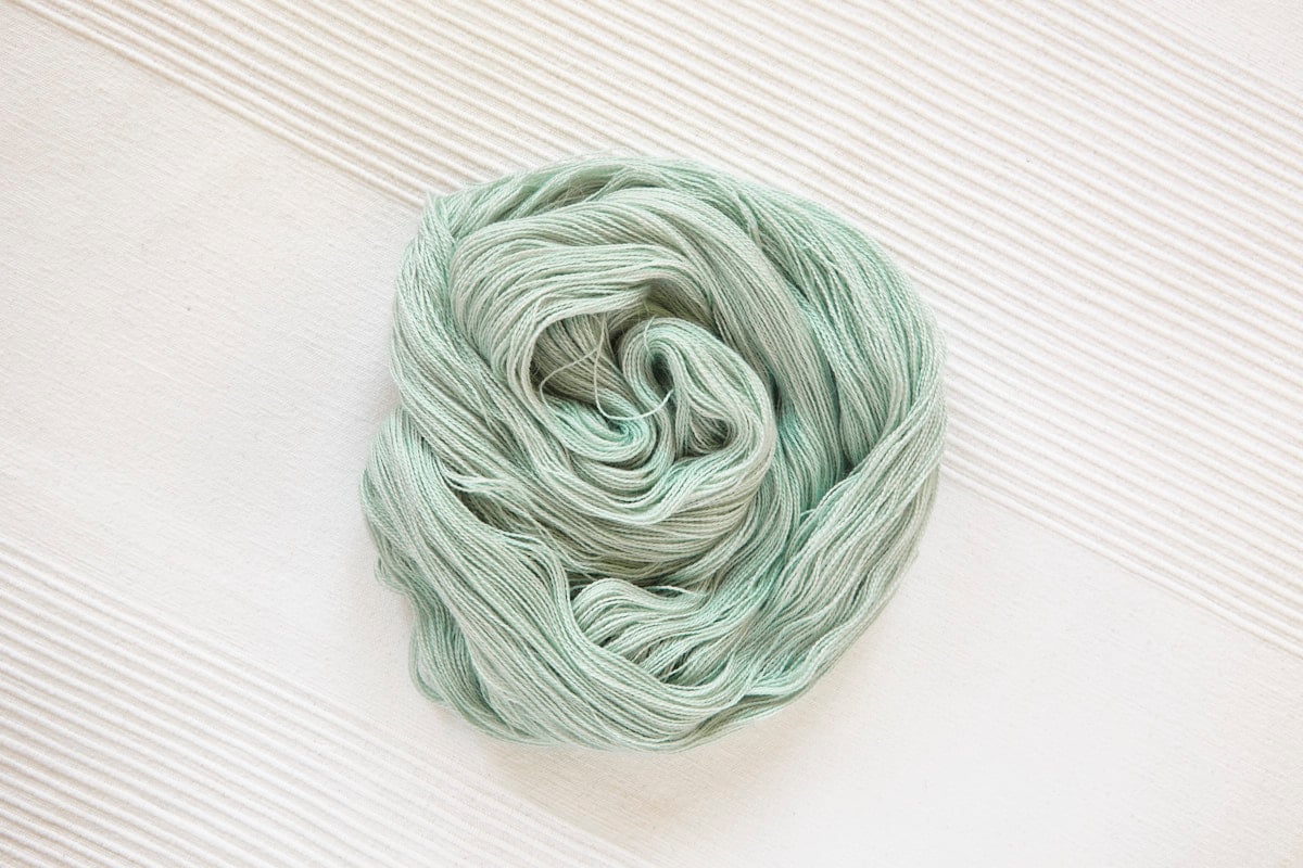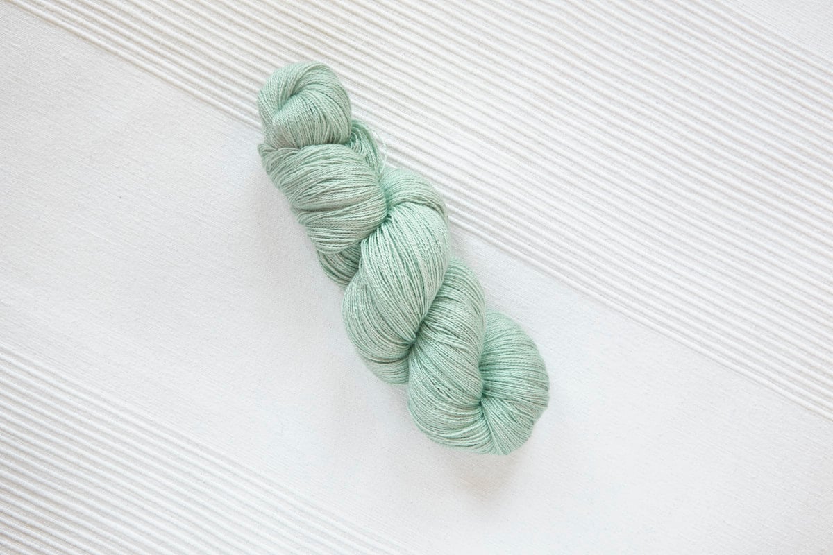 Whisper (Lace) in colorway: Frosted Jade. Semi-solid. Light blueish green with very slight tonal variegation