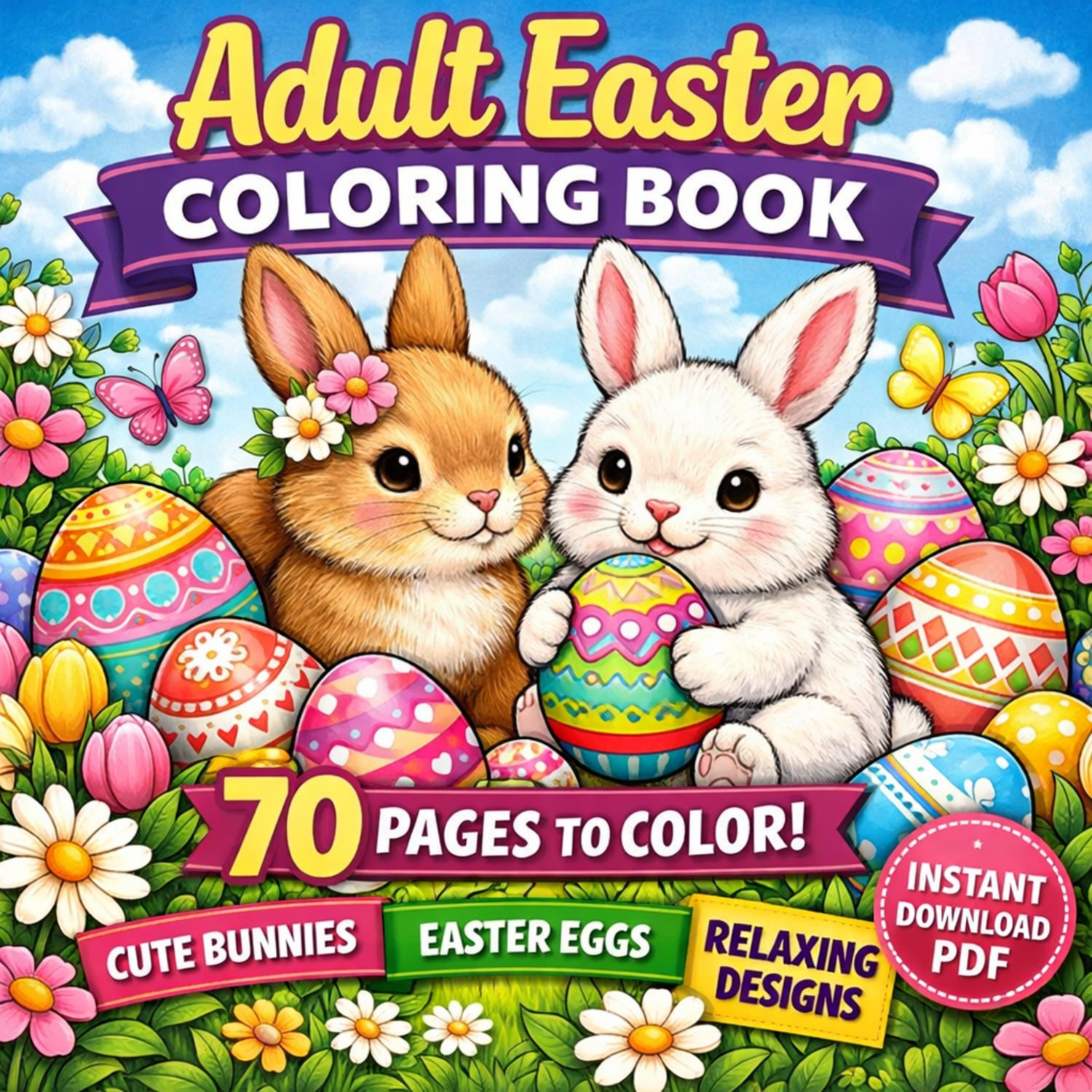 Adult Easter Coloring Book Printable – 70 Bunny & Easter Egg Coloring Pages for Relaxation | Instant Download PDF | Spring Coloring Pages for Adults