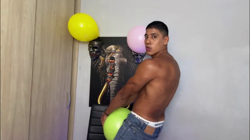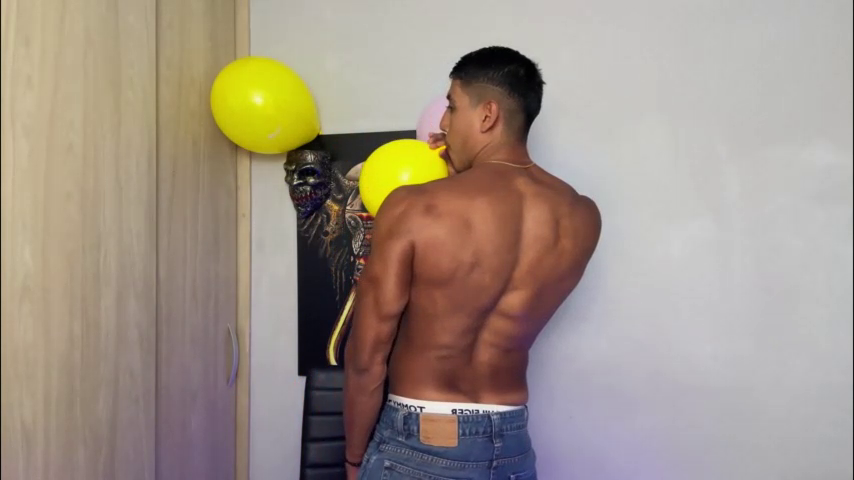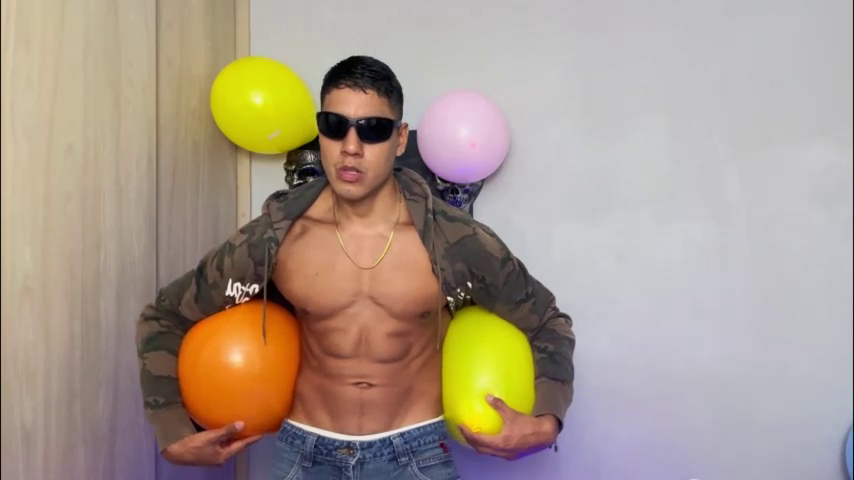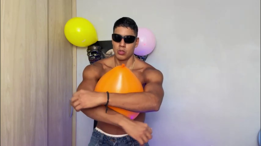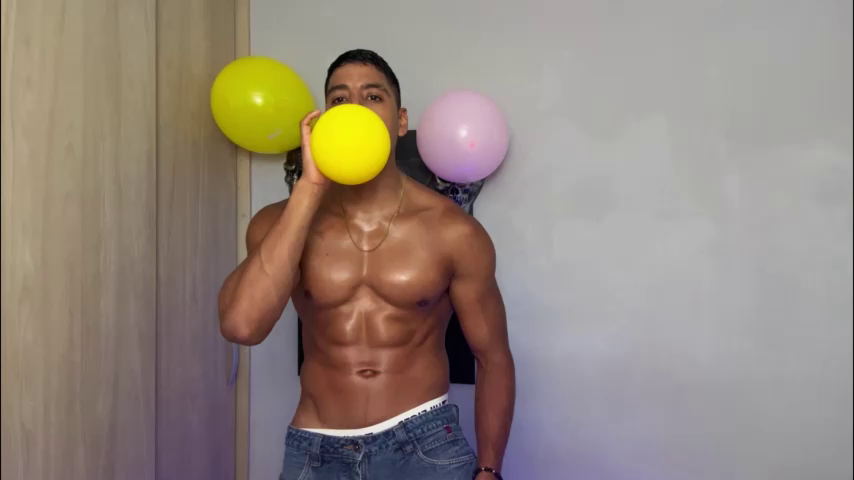 Watch Mariano as he playfully interacts with balloons, takes off his t-shirt, and inflates several before enjoying the thrill of popping them. This video runs for 17 minutes.