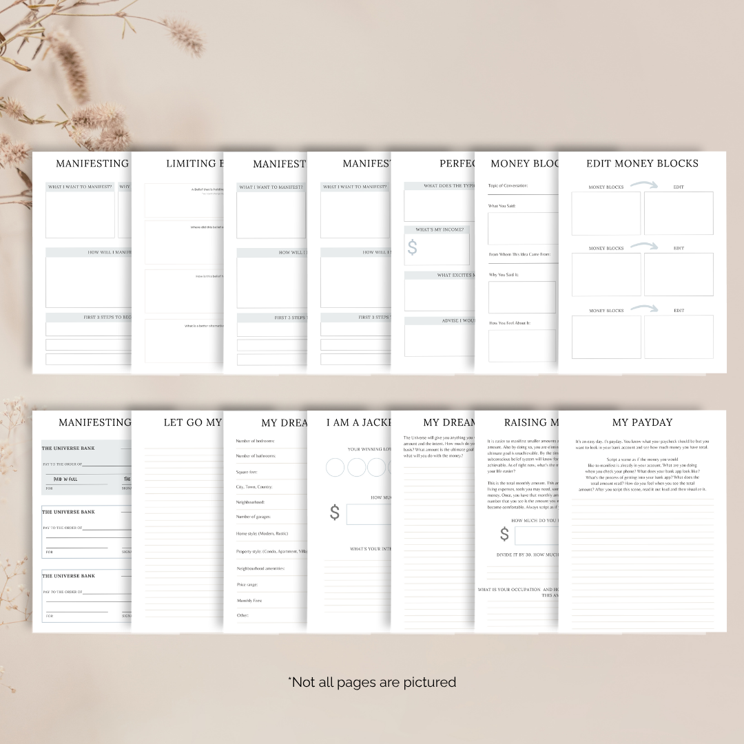 - Manifesting Worksheets: Dedicated sections for manifesting specific desires like wealth, a new home, or a car, with prompts to define your 'why' and outline first steps.