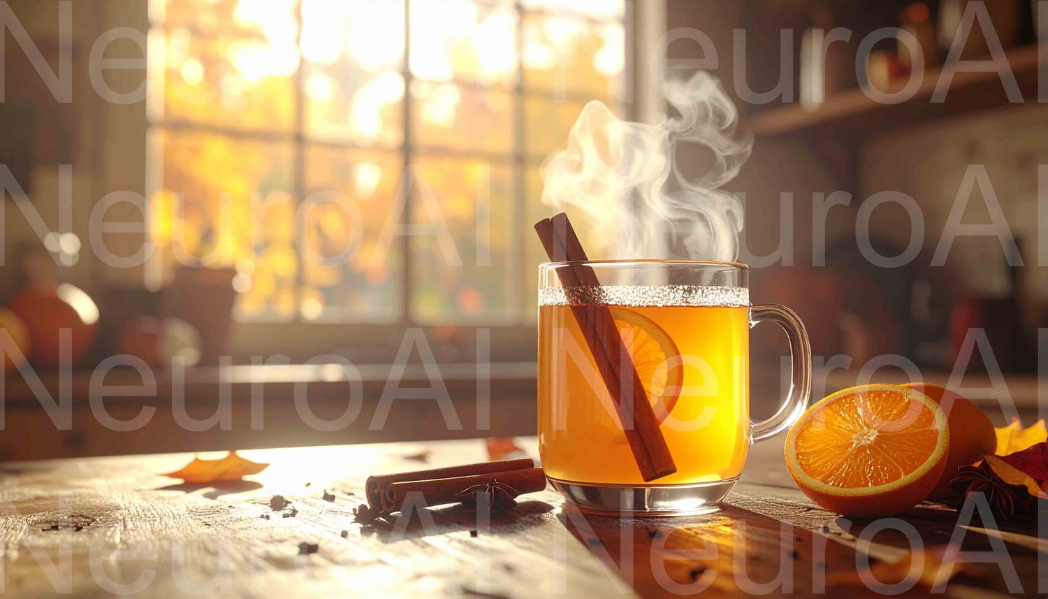 Steaming hot cider with orange and cinnamon, cozy autumn vibes