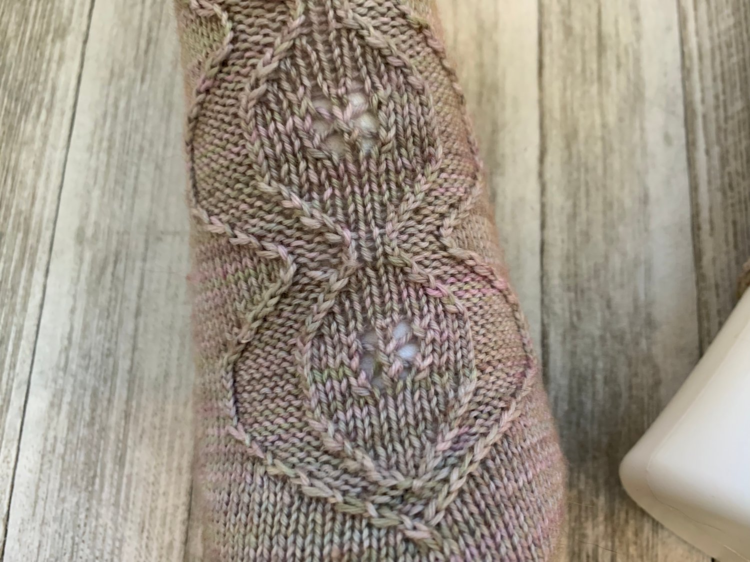 This is a wonderfully complex combination of cables and twisted stitches with a hint of eyelets that bring an elegant look to your socks. The design represents the expansion and contraction as we breathe deeply into our lungs and exhale fully. It would look great with tonals, gradients and handspun.