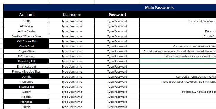 Simple and functional password tracker for Excel. A great way to keep usernames, passwords, and extra notes in one place.