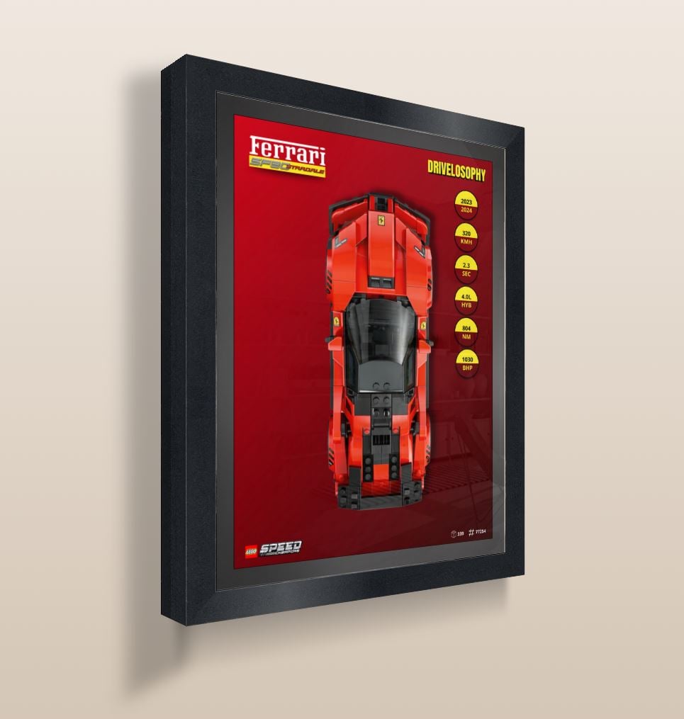Mets en valeur ta LEGO Ferrari SF90 XX Stradale #77254 avec une affiche au format vertical, conçue comme fond de présentation, la voiture venant se placer dans le cadre après impression.