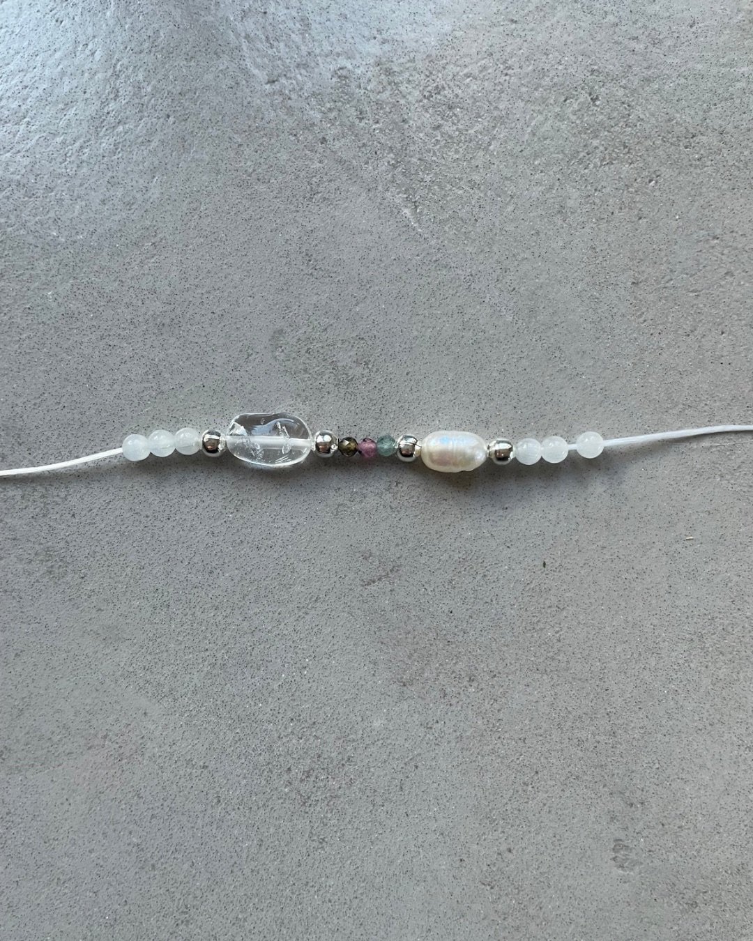 Bestandteile: Metalldraht, Metallverschluss (nickelfrei), Gummiband, Edelsteine (unten aufgeführt), Metallperlen (vergoldet oder versilbert)