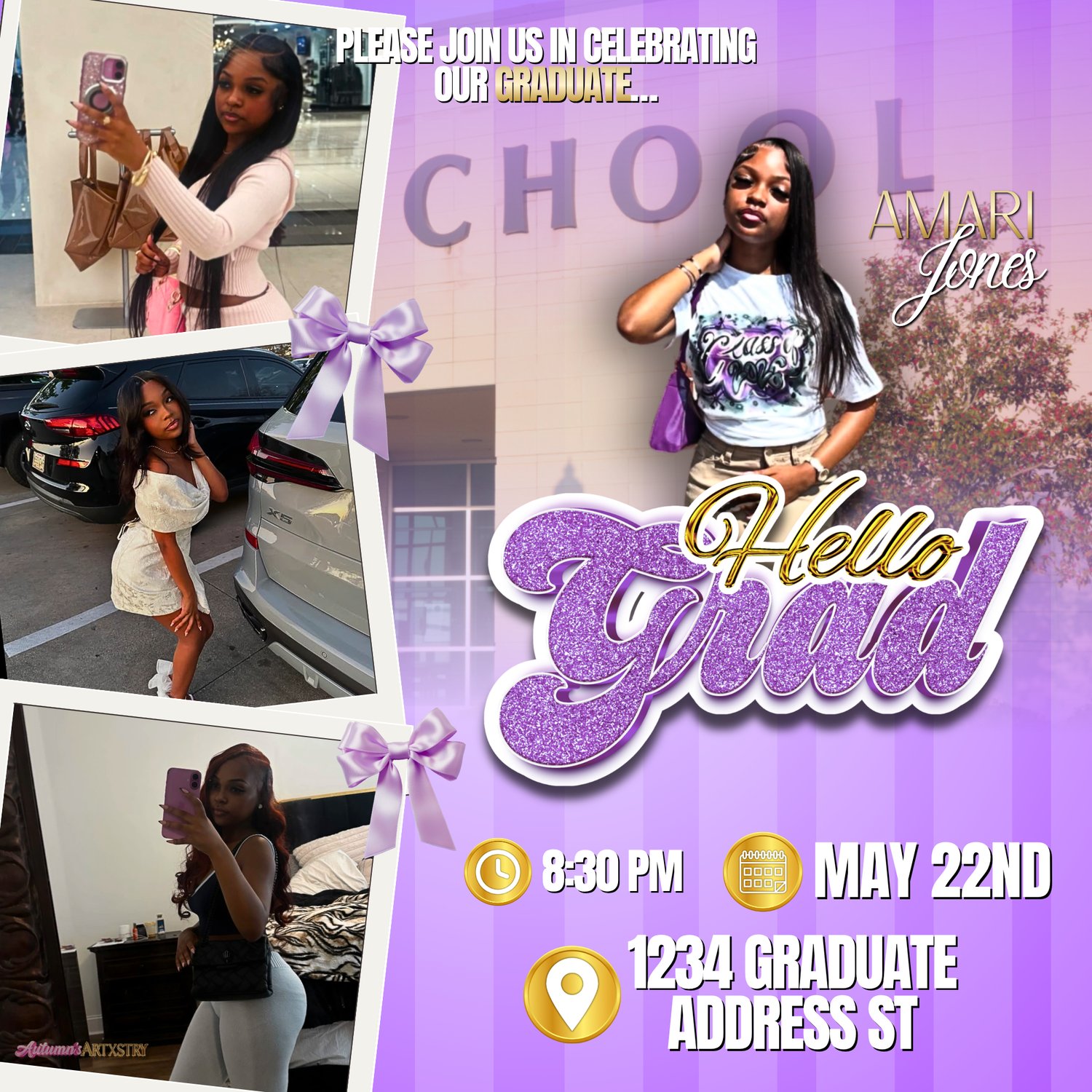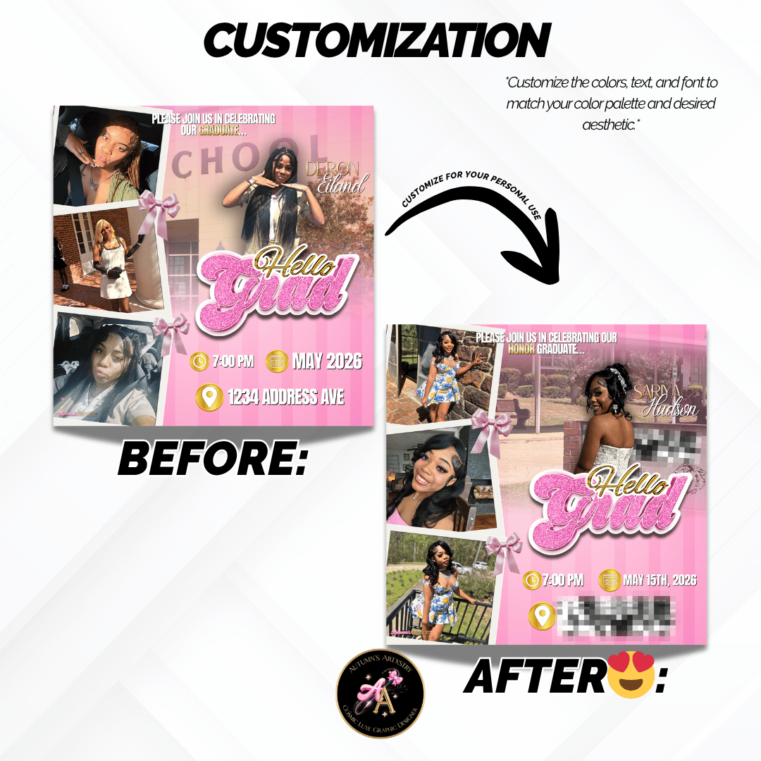Celebrate your graduation in style with this soft and elegant “Hello Grad” pink invitation template. Perfect for announcing your graduation party, send-off, or celebration, this design combines a classy aesthetic with a modern, feminine touch.