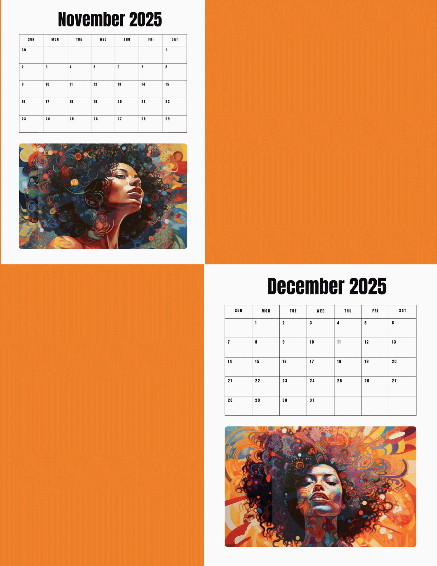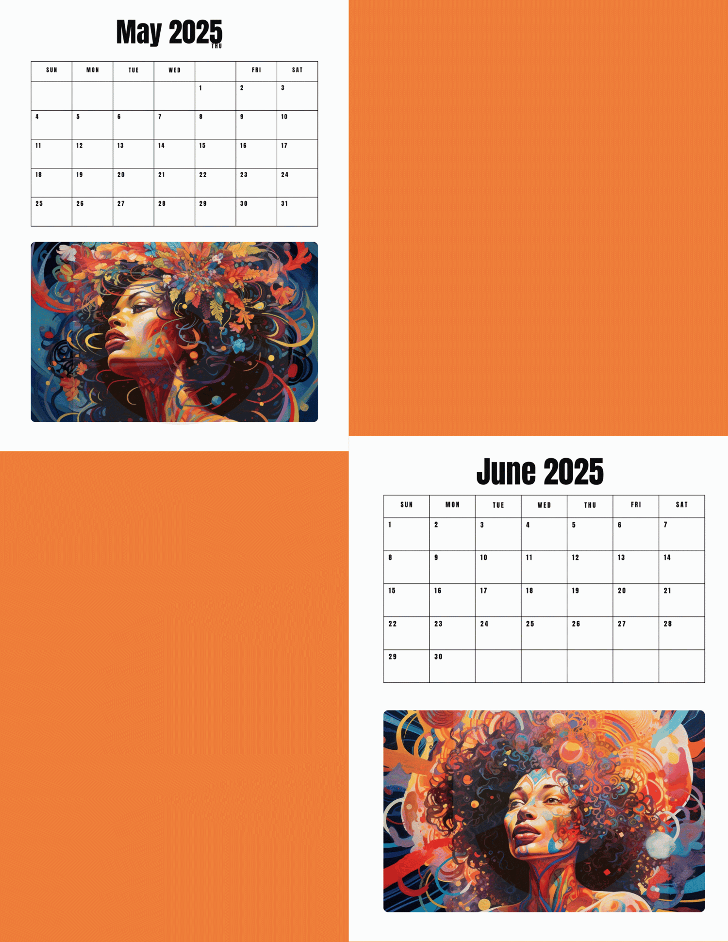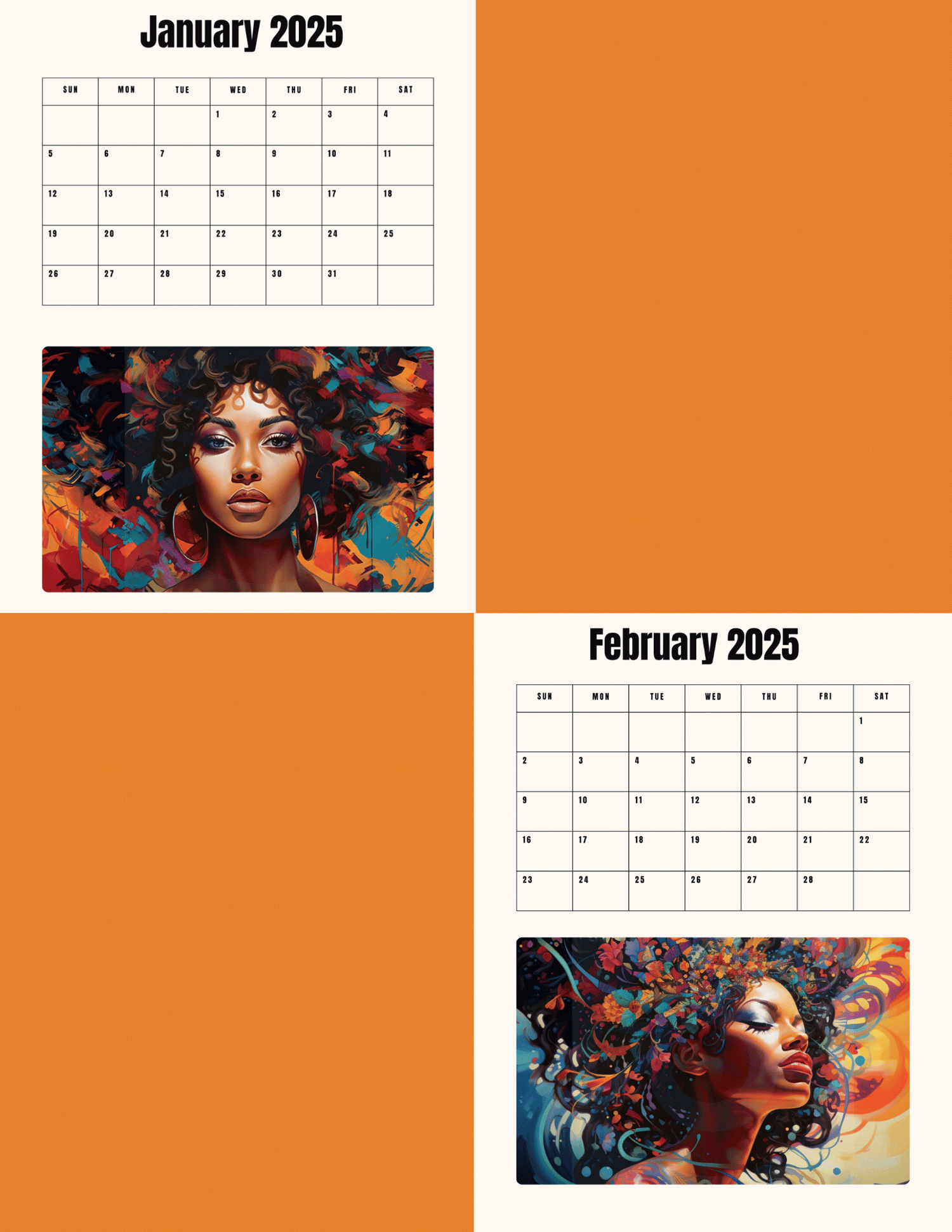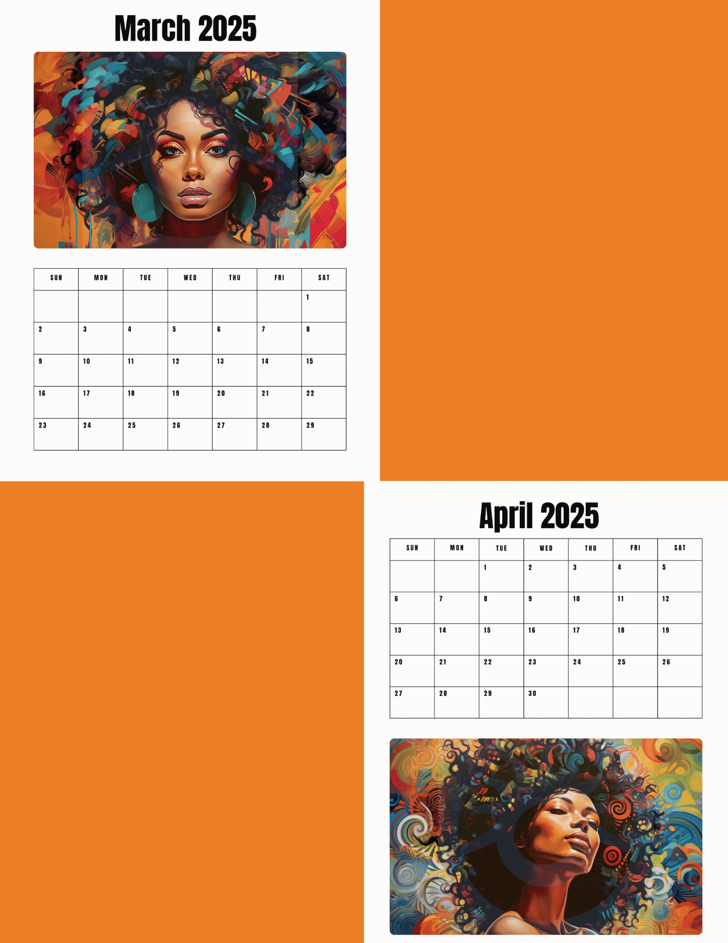 Add a touch of artistry and inspiration to your year with this unique 2025 calendar, showcasing vibrant, soulful portraits each month. Perfect for art lovers, creatives, and anyone looking to elevate their living or workspace with monthly doses of color and character.