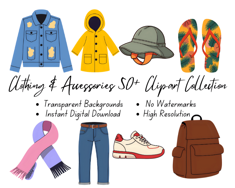 Clothing & Accessories 50+ Clipart Collection | High-Resolution Digital Printables | Instant Download | No Watermark