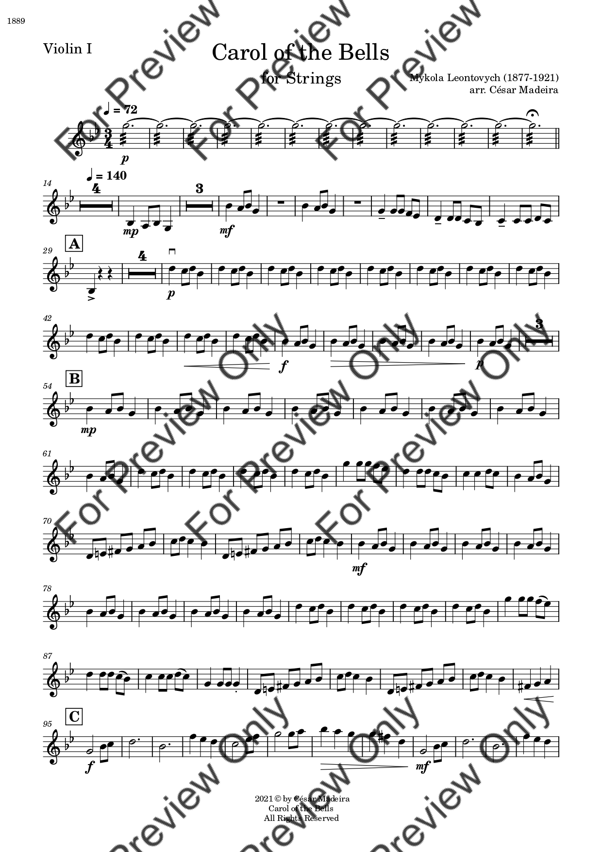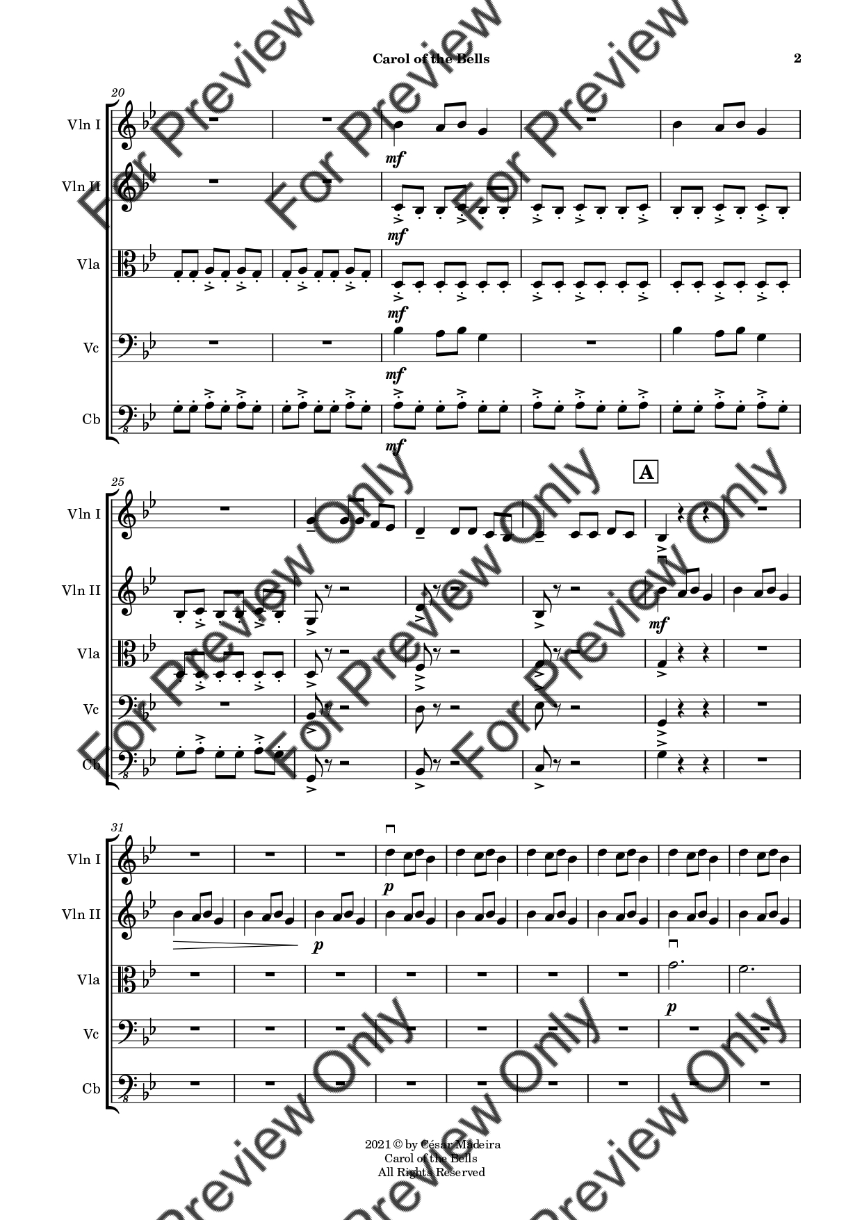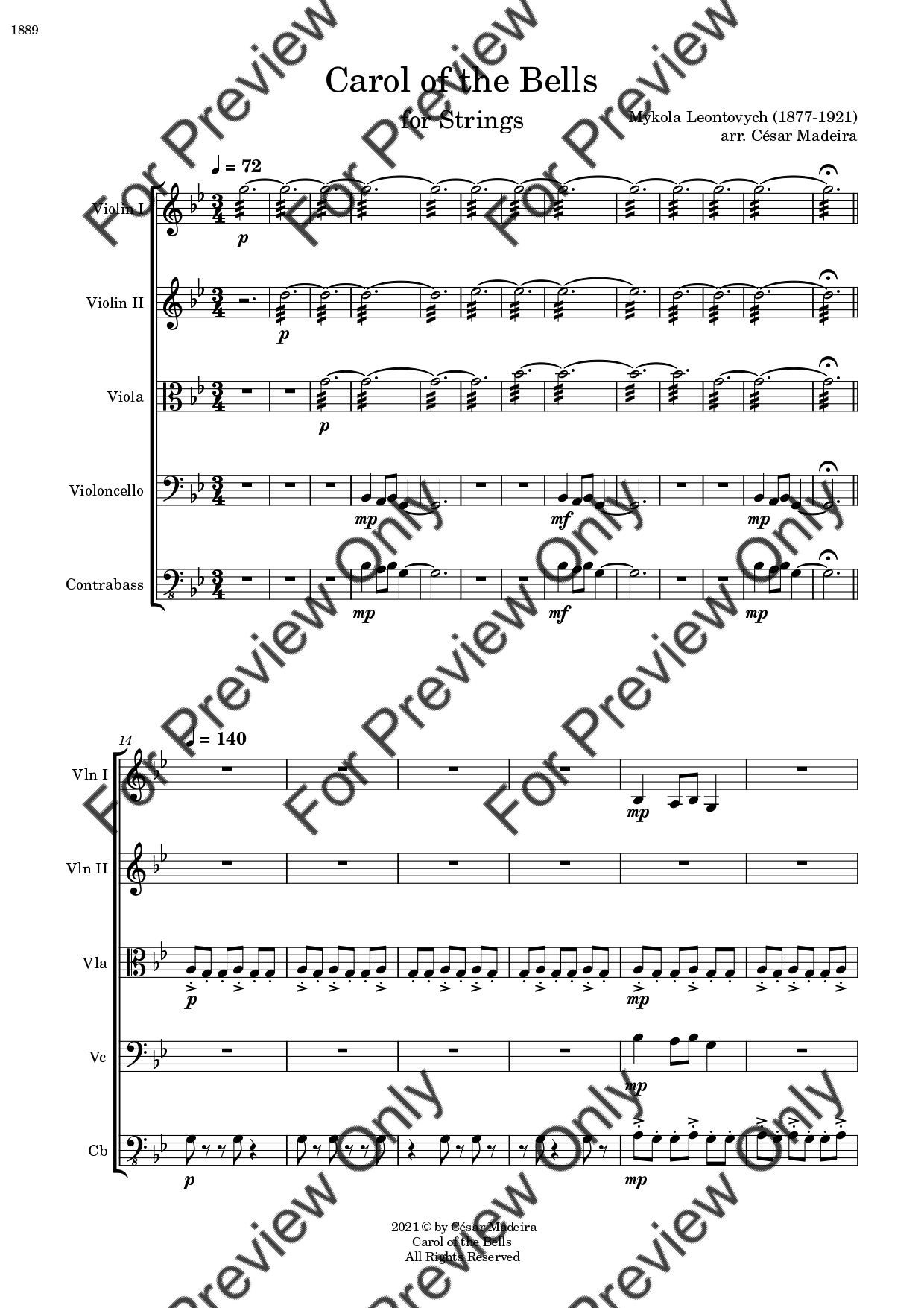 Carol Of The Bells by Mykola Leontovych. Arrangement for String Orchestra - Violin 1, 2, Viola, Violoncello and Contrabass. With Full Score and Individual Parts. Have fun!